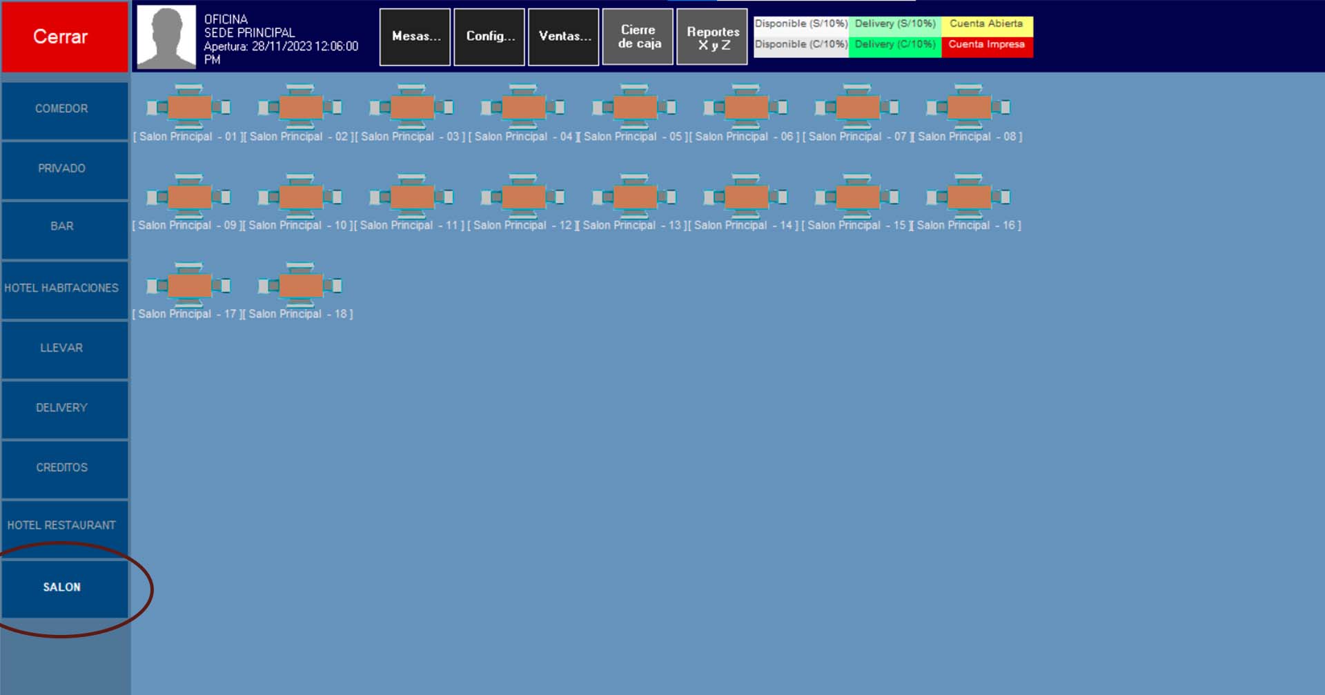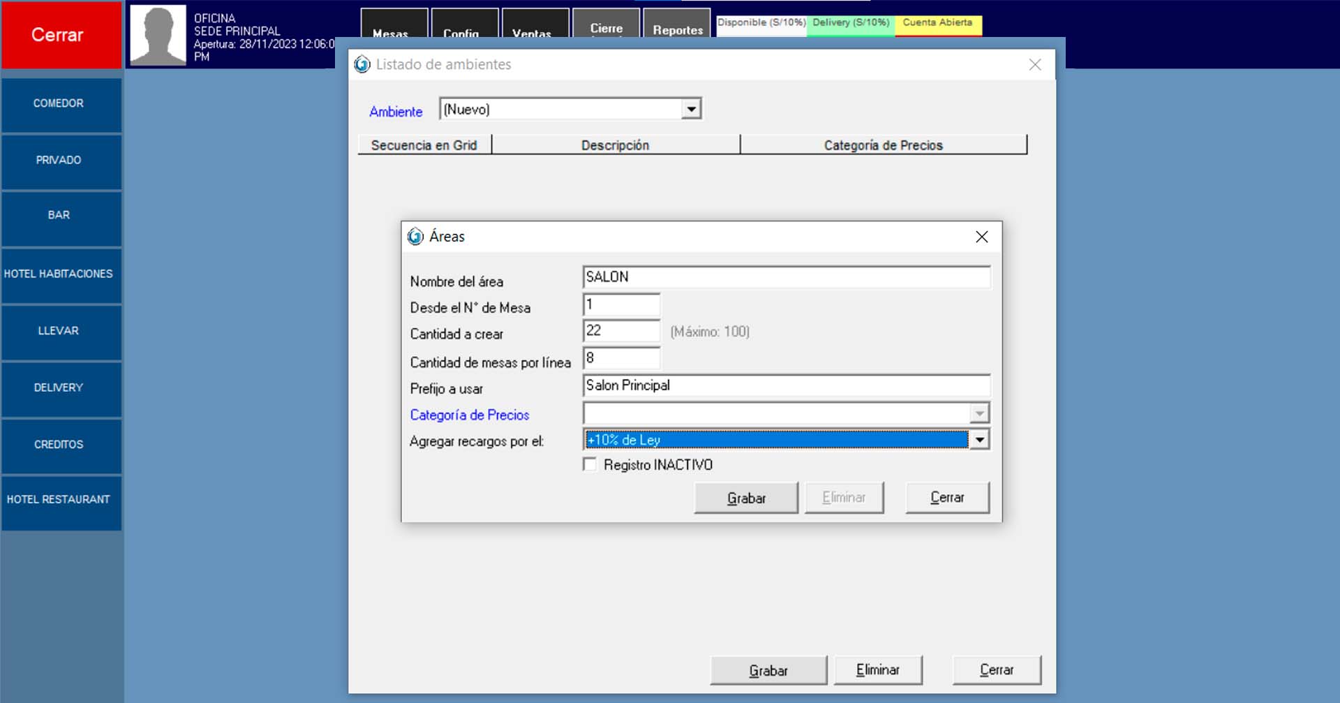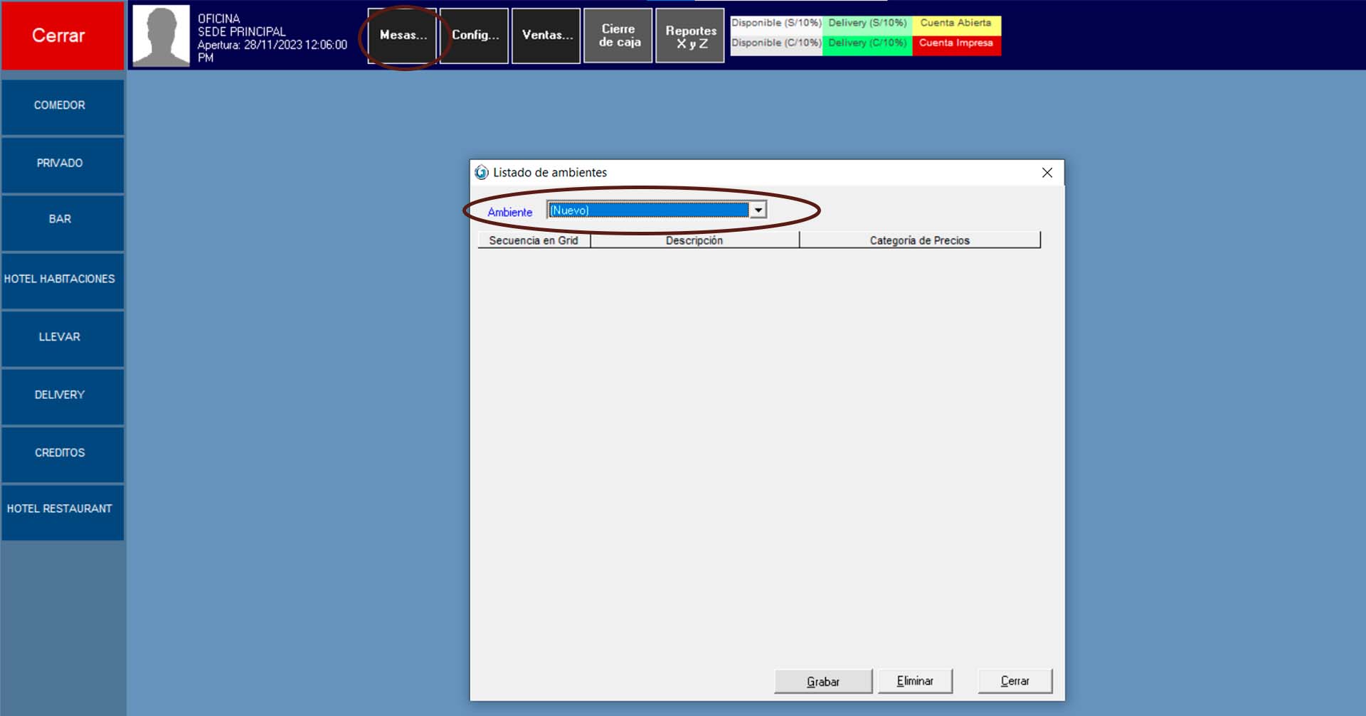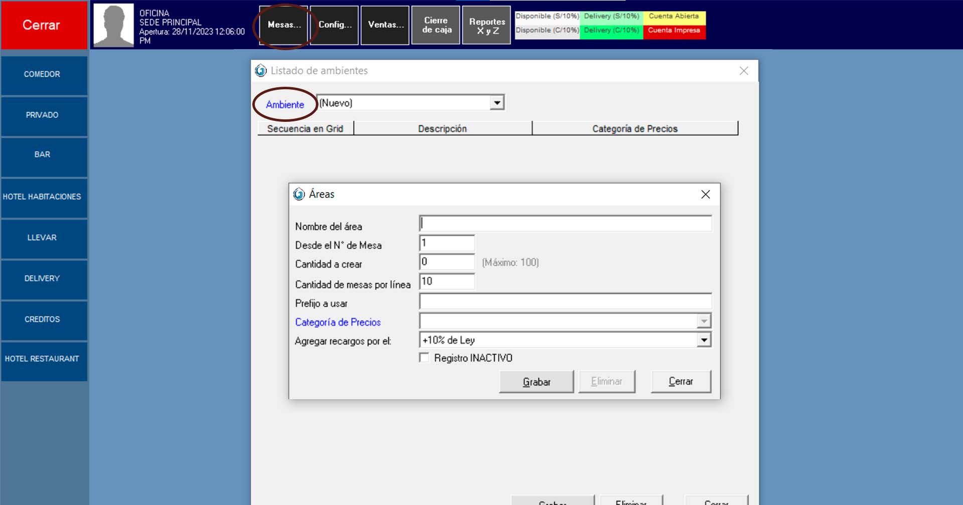 - Luego clic en el botón de «Mesas…» ubicado en el menú superior del (POS), aparecerá una ventana llamada «Listado de ambientes»……“ REFERENCIA “