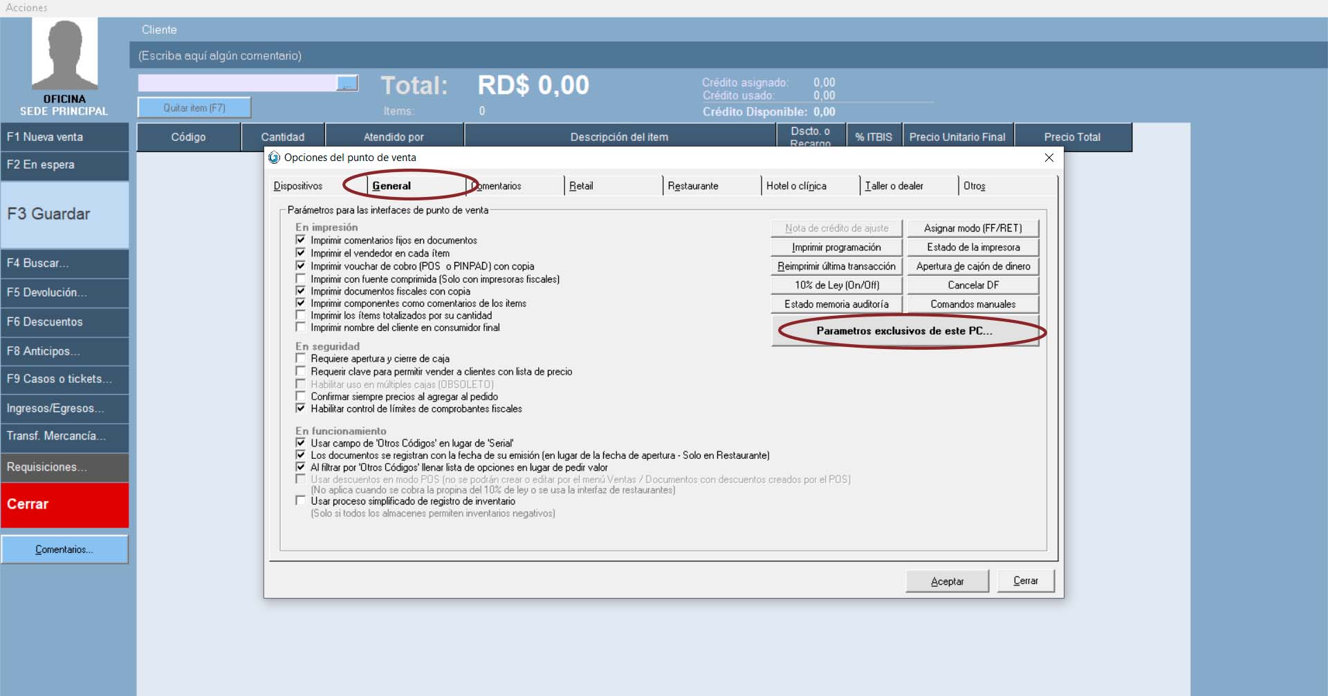 - En la ventana de POS, haga clic en el menú «Acciones > Preferencias»…»REFERENCIA»