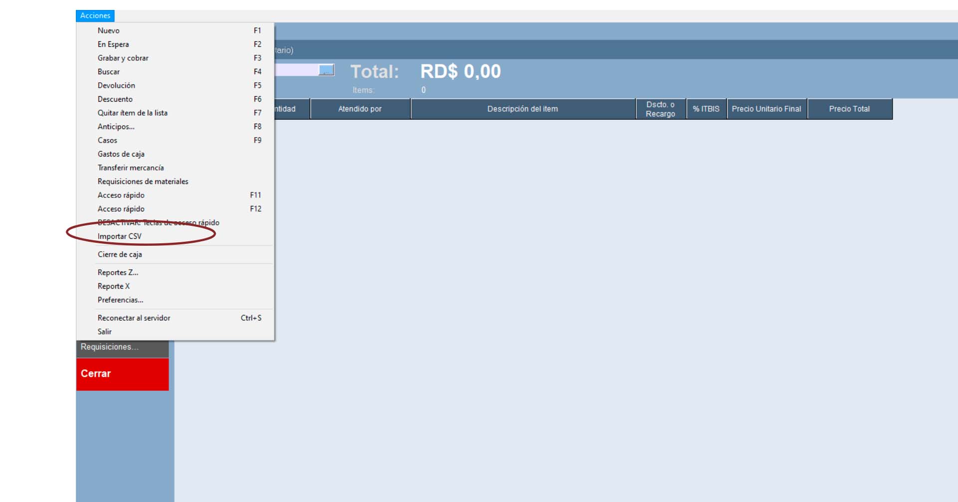 - Para importarlo a la ventana del POS, haga clic en el menú «Acciones > Importar CSV», indique la ubicación del archivo y clic en el botón «Abrir», se agregará a la lista todo el contenido del archivo, tomando en consideración las promociones, listas de precios, descuentos, etc. que aplique al cliente…»REFERENCIA»