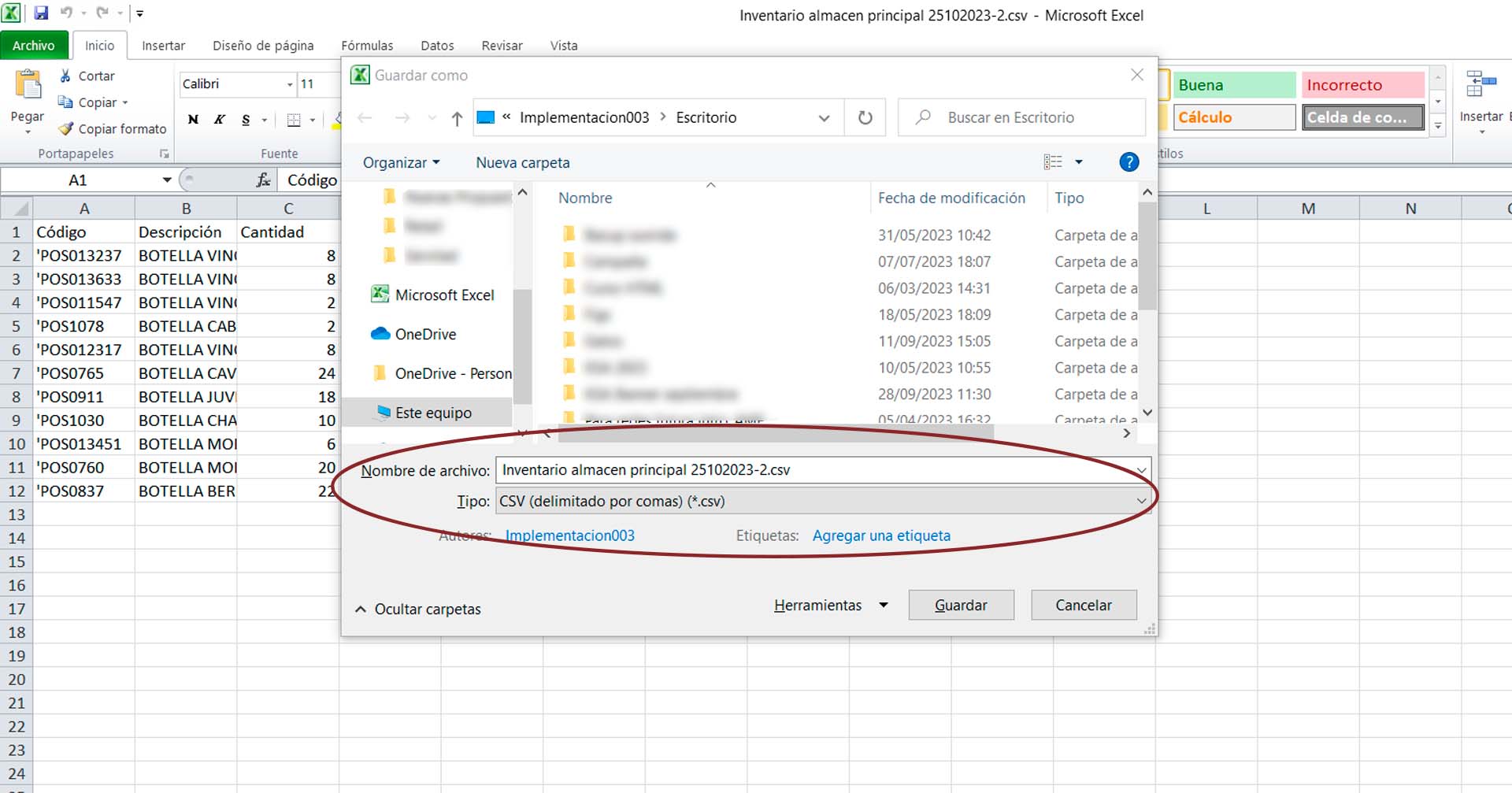 - El archivo debe ser guardado en formato «CSV Delimitado por comas»…»REFERENCIA»