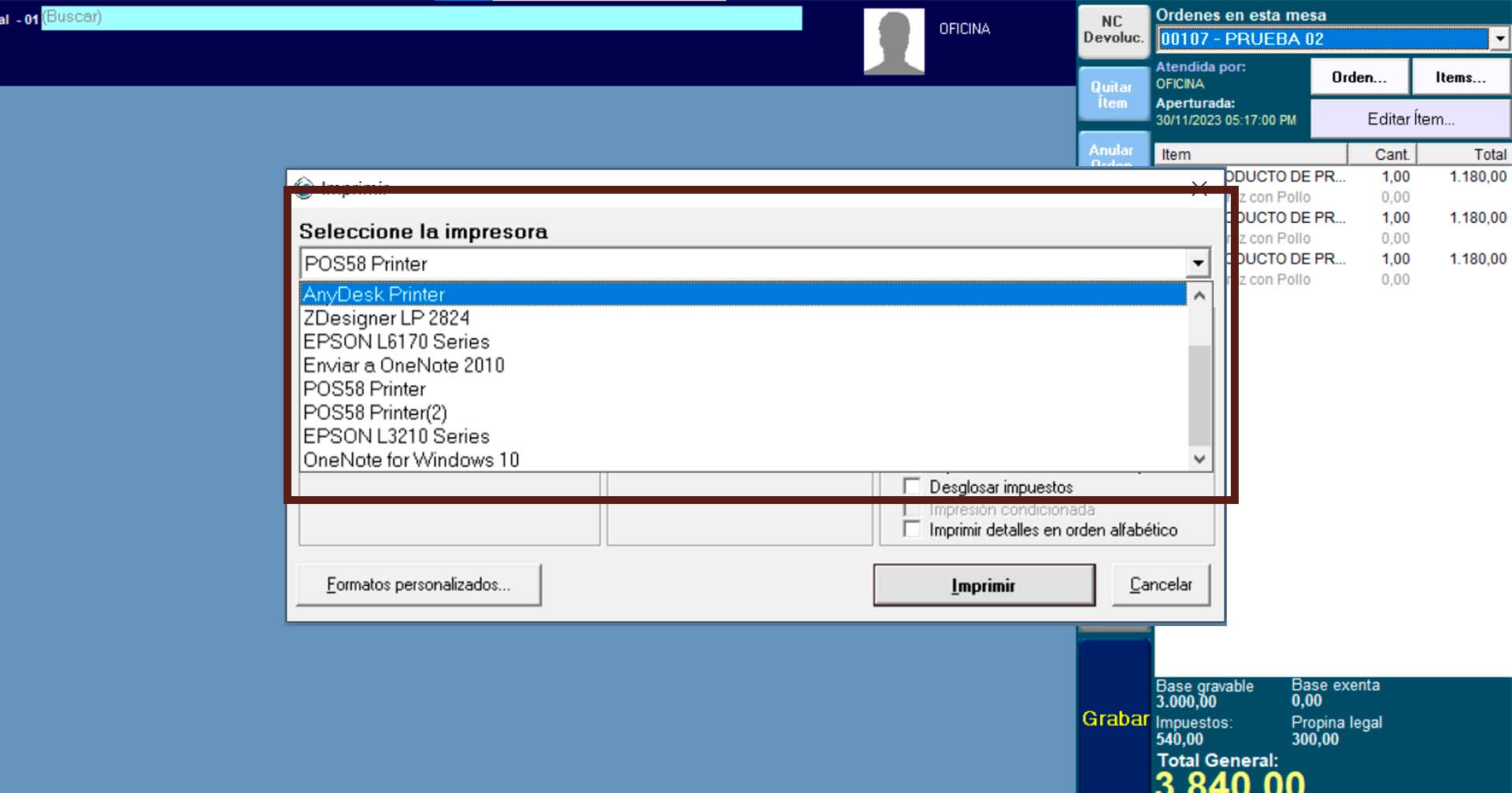 Impresion de la comanda