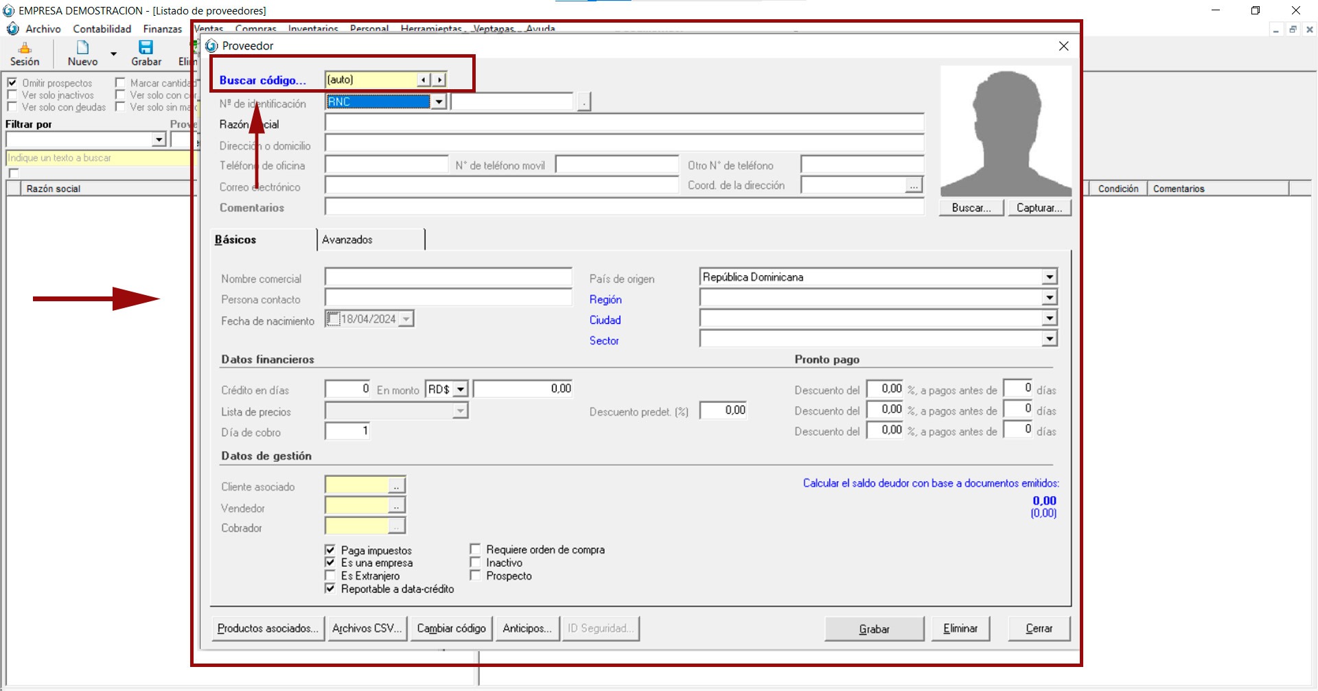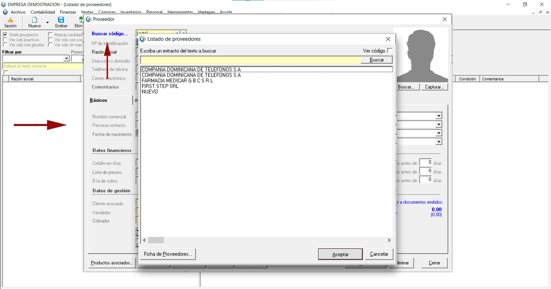 – O junto al campo de color amarillo «Buscar código» …“REFERENCIA” >Podemos buscar un proveedor creado previamente colocando sus iniciales para una búsqueda directa o simplemente oprimiendo el botón «ENTER» después de hacer clic … “REFERENCIA” > y hacemos doble clic en el proveedor que queramos modificar