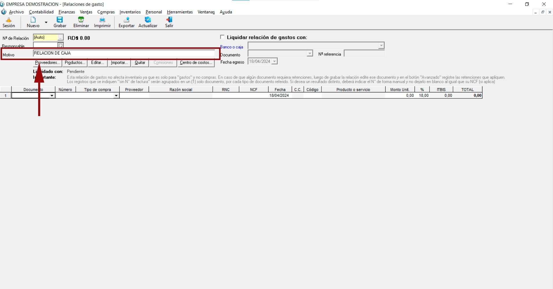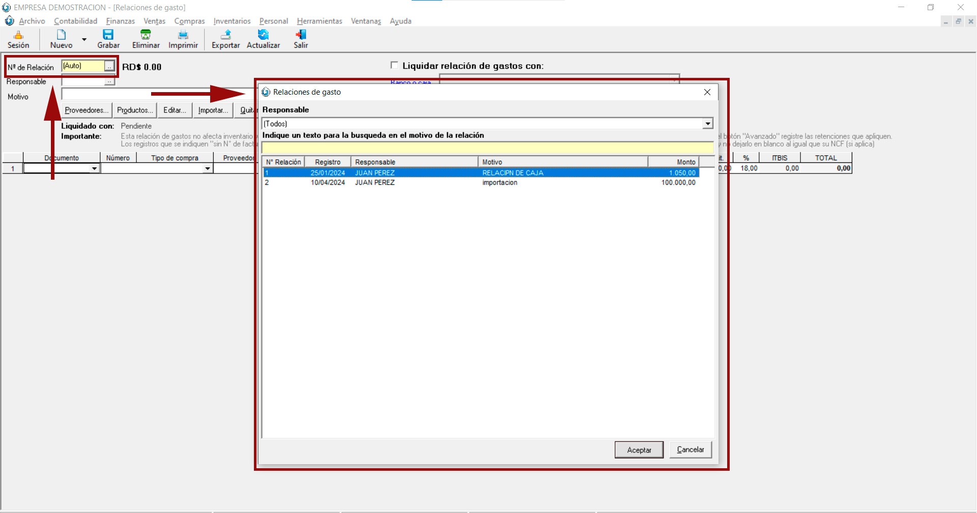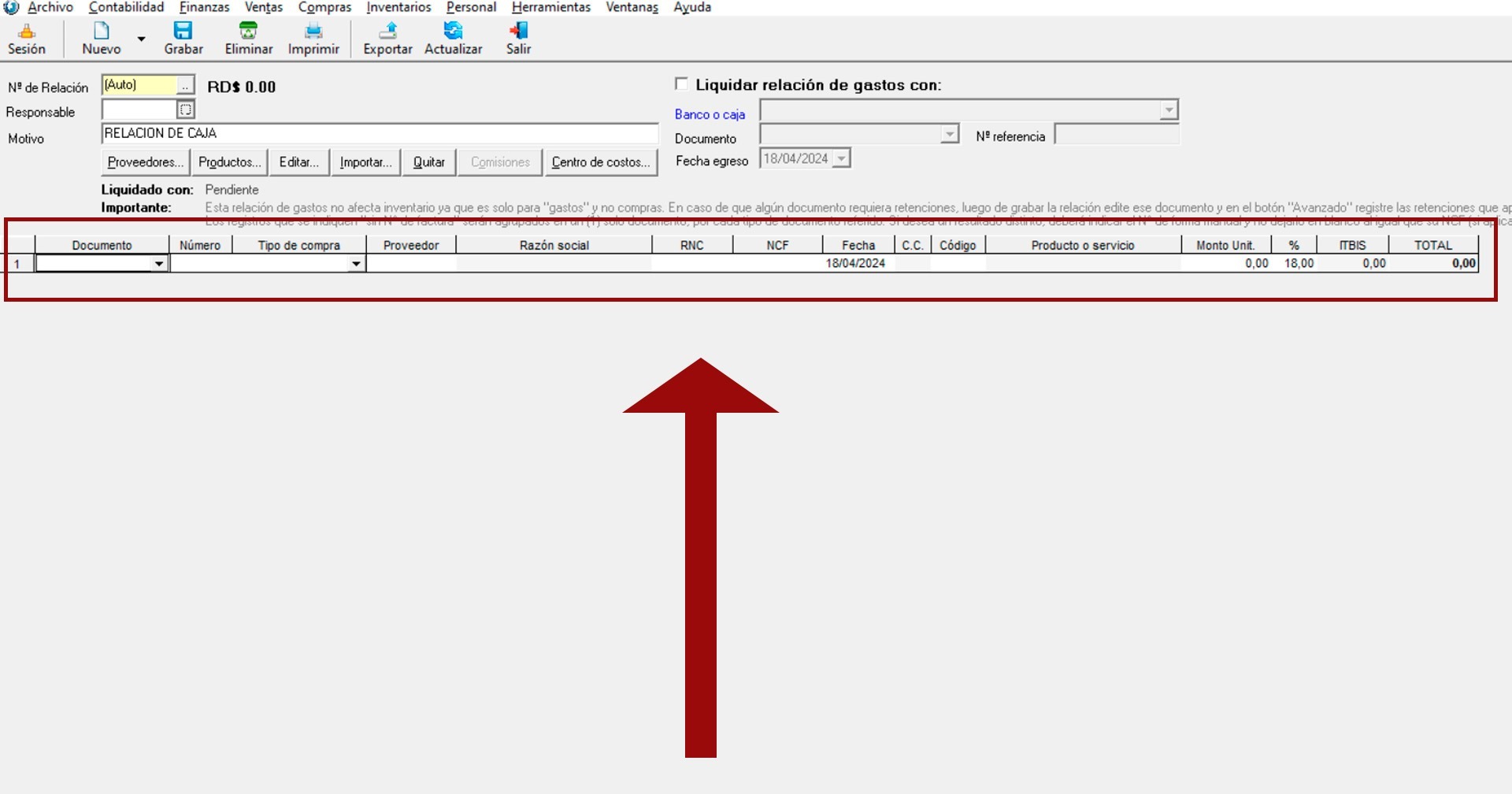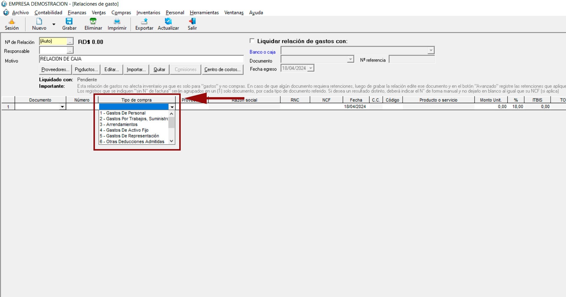 -Ingresamos al Menú > Compras > Relaciones de gastos >…“REFERENCIA” se abrirá la siguiente ventana… “REFERENCIA”