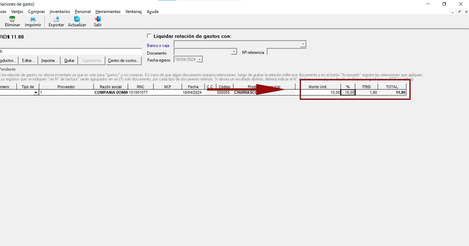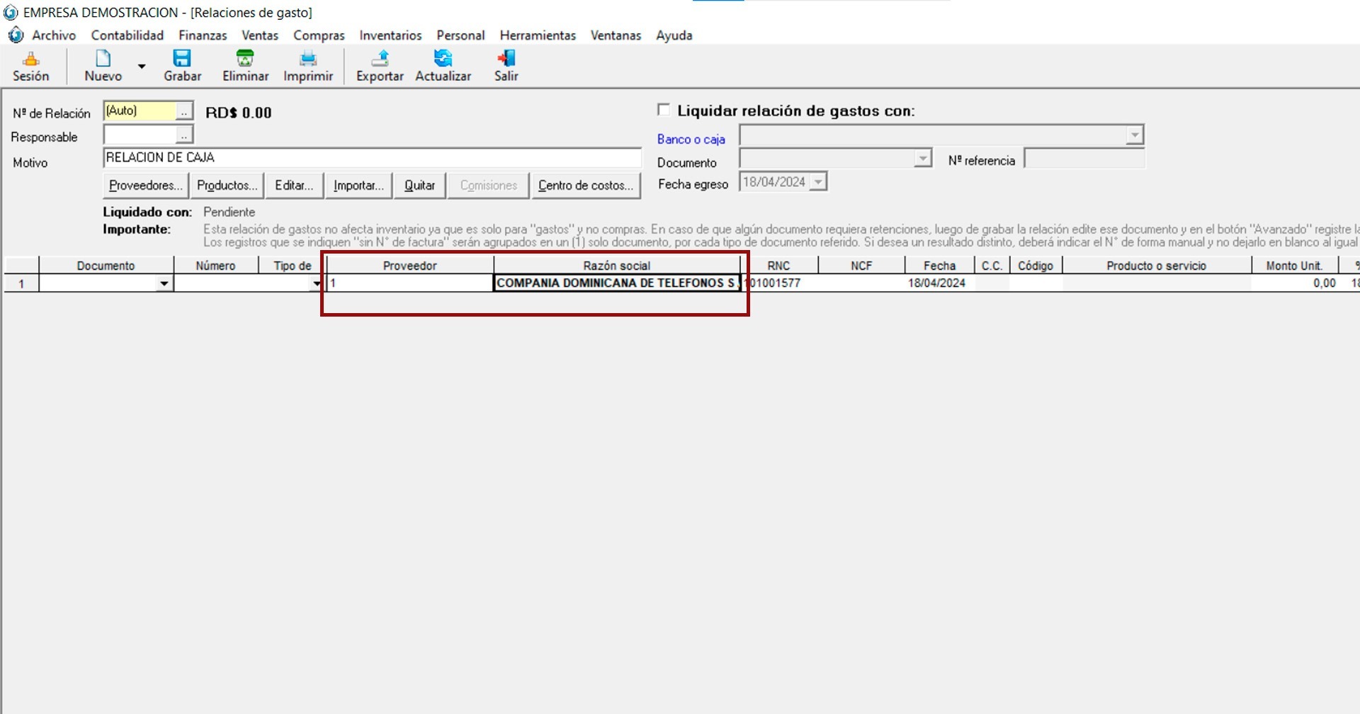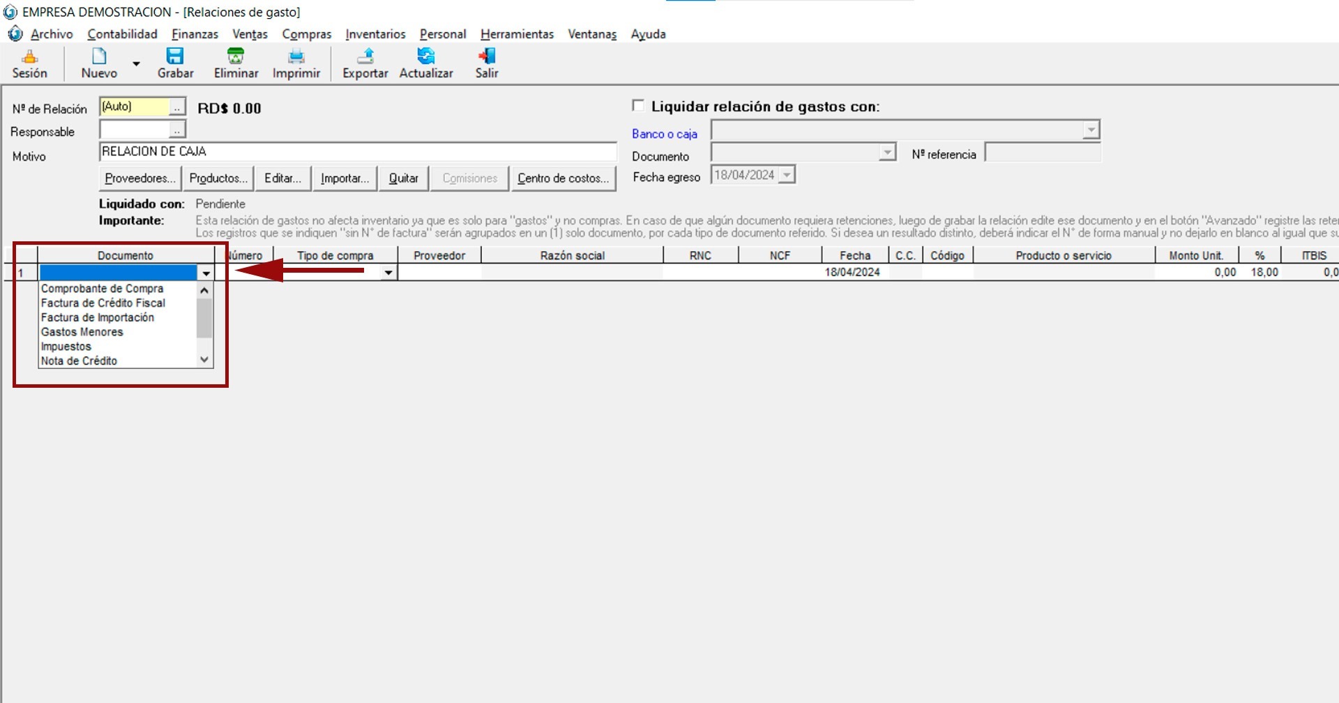 -Ingresamos al Menú > Compras > Relaciones de gastos >…“REFERENCIA” se abrirá la siguiente ventana… “REFERENCIA”
