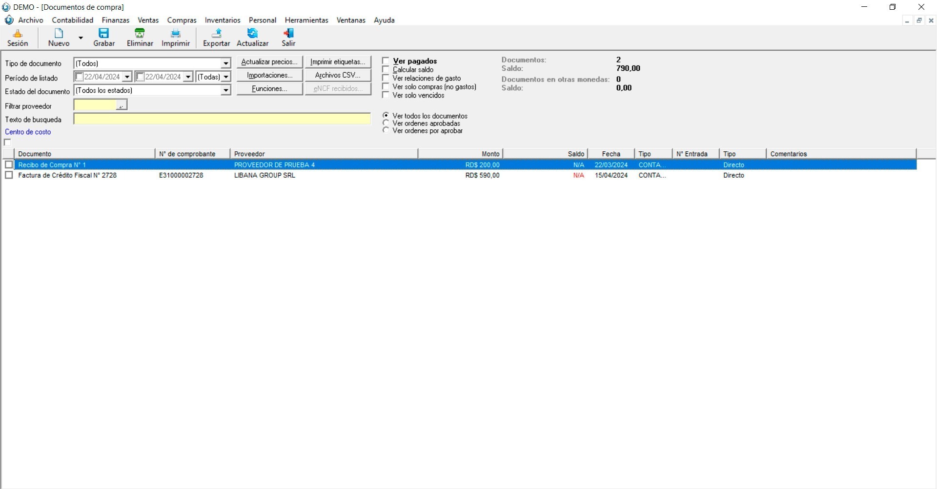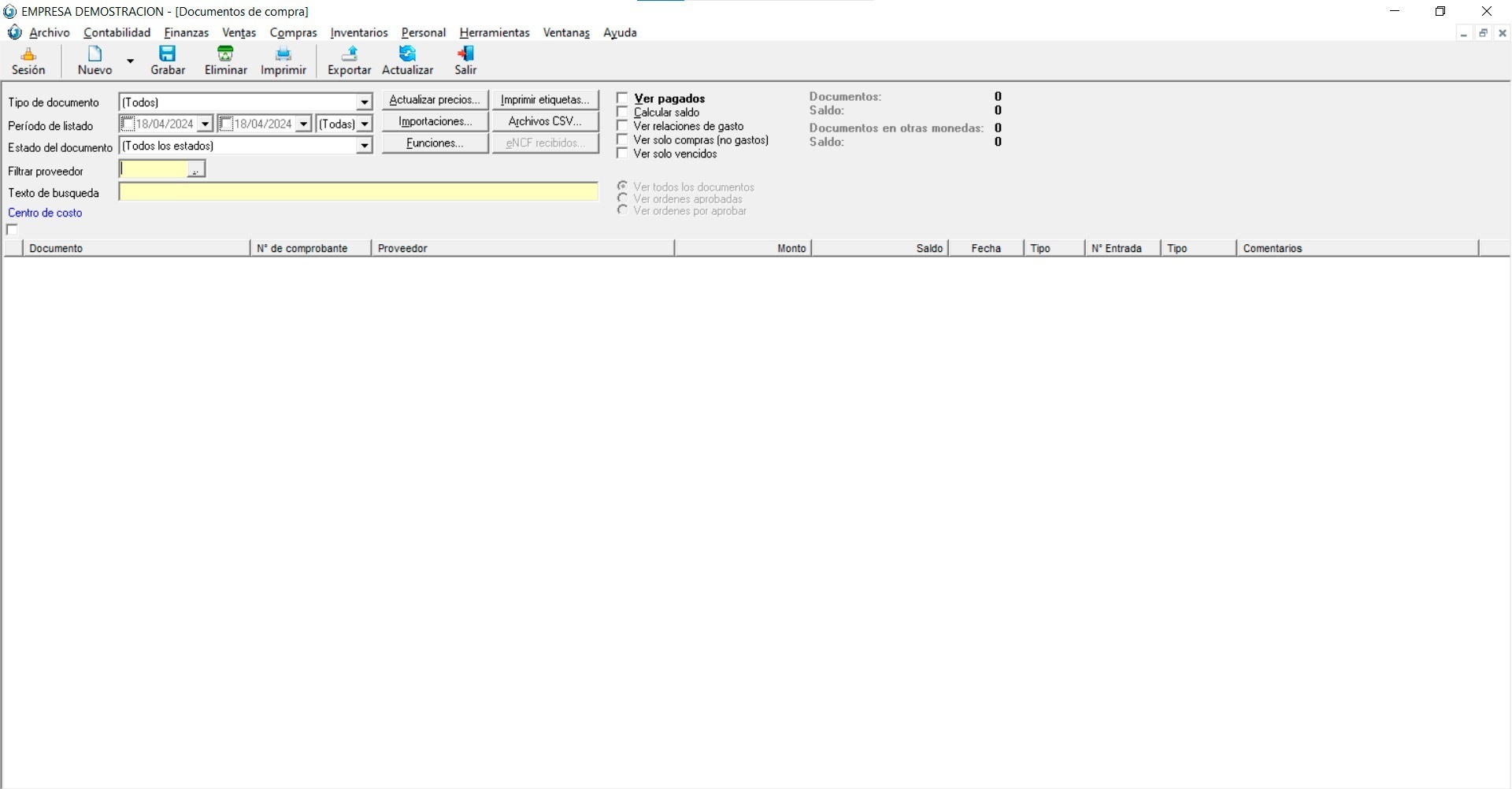 -Ingresamos al Menú > Compras > Documentos >…“REFERENCIA” se abrirá la siguiente ventana… “REFERENCIA”, En esta ventana podremos buscar y filtrar documentos realizados previamente … “REFERENCIA”