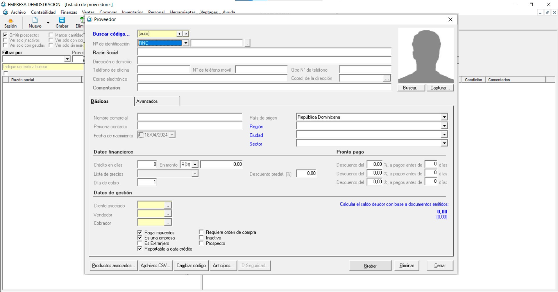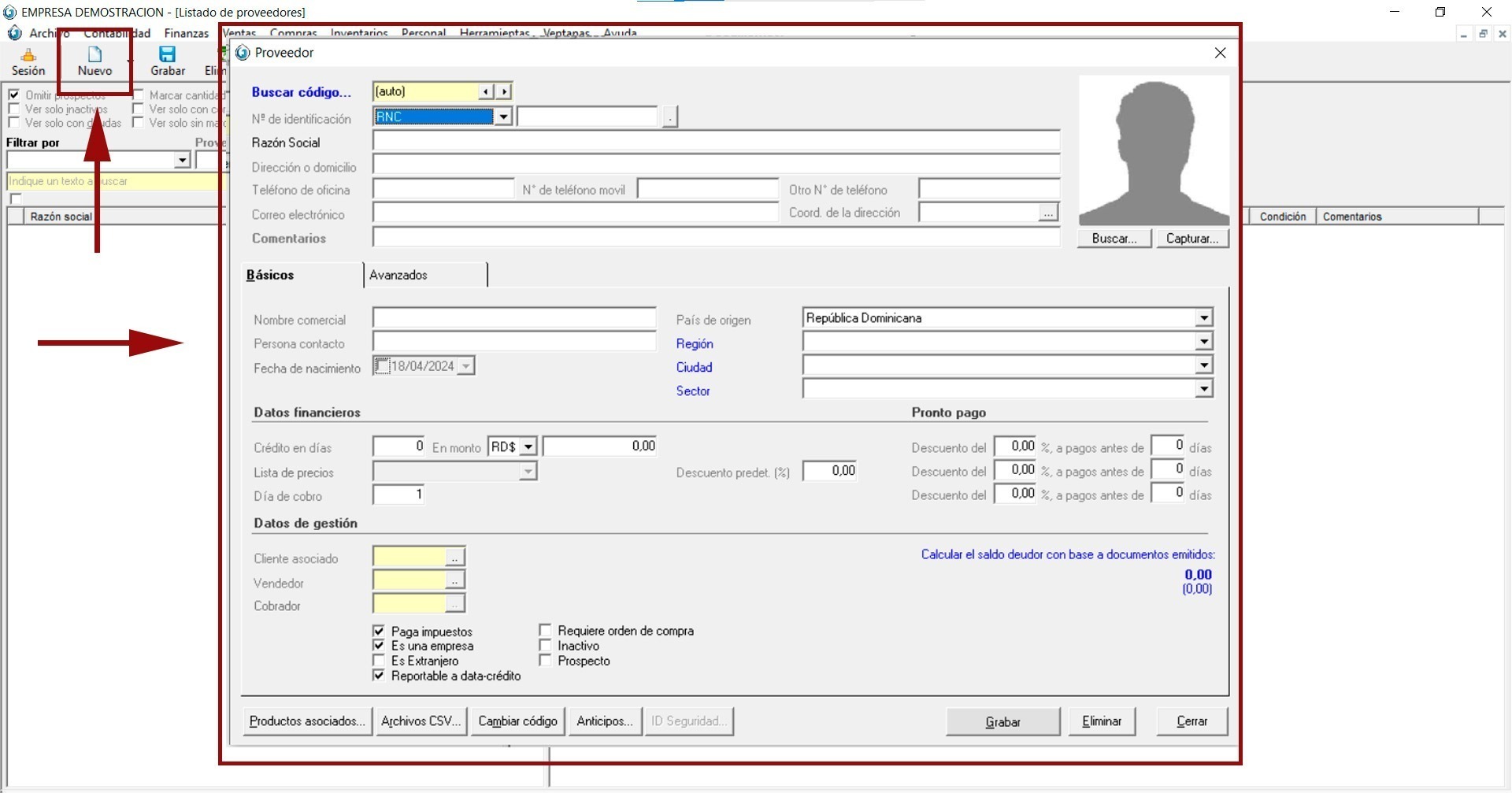 – Hacemos clic en el Menú «NUEVO»> Se abrirá la ficha de creación de proveedores, procedemos a llenar los datos … “REFERENCIA”