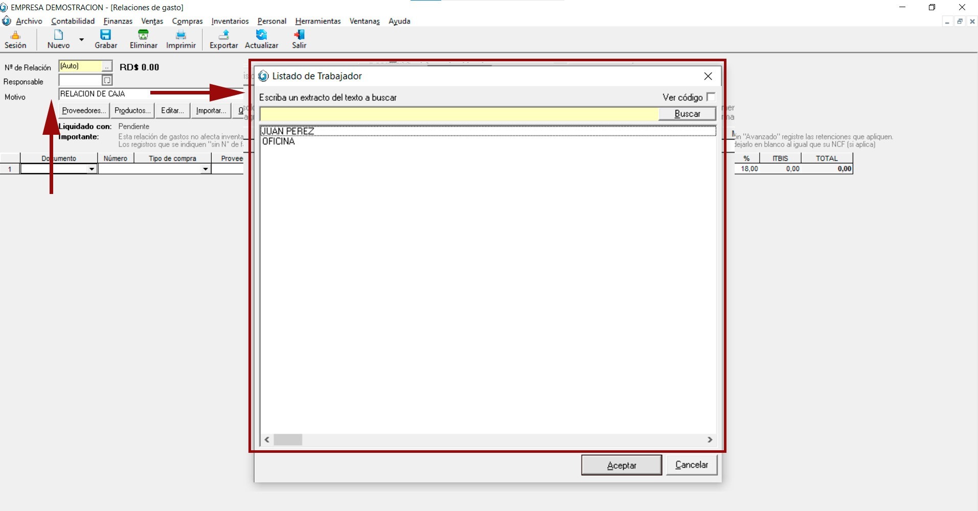 -Debajo de ese campo podemos ver uno que se llama «RESPONSABLE», donde podemos asignar a la persona encargada de esa relación de gastos… “REFERENCIA” y Junto con esto debajo está el campo «Motivo», para poner el nombre a la relación de gastos a realizar …“REFERENCIA”