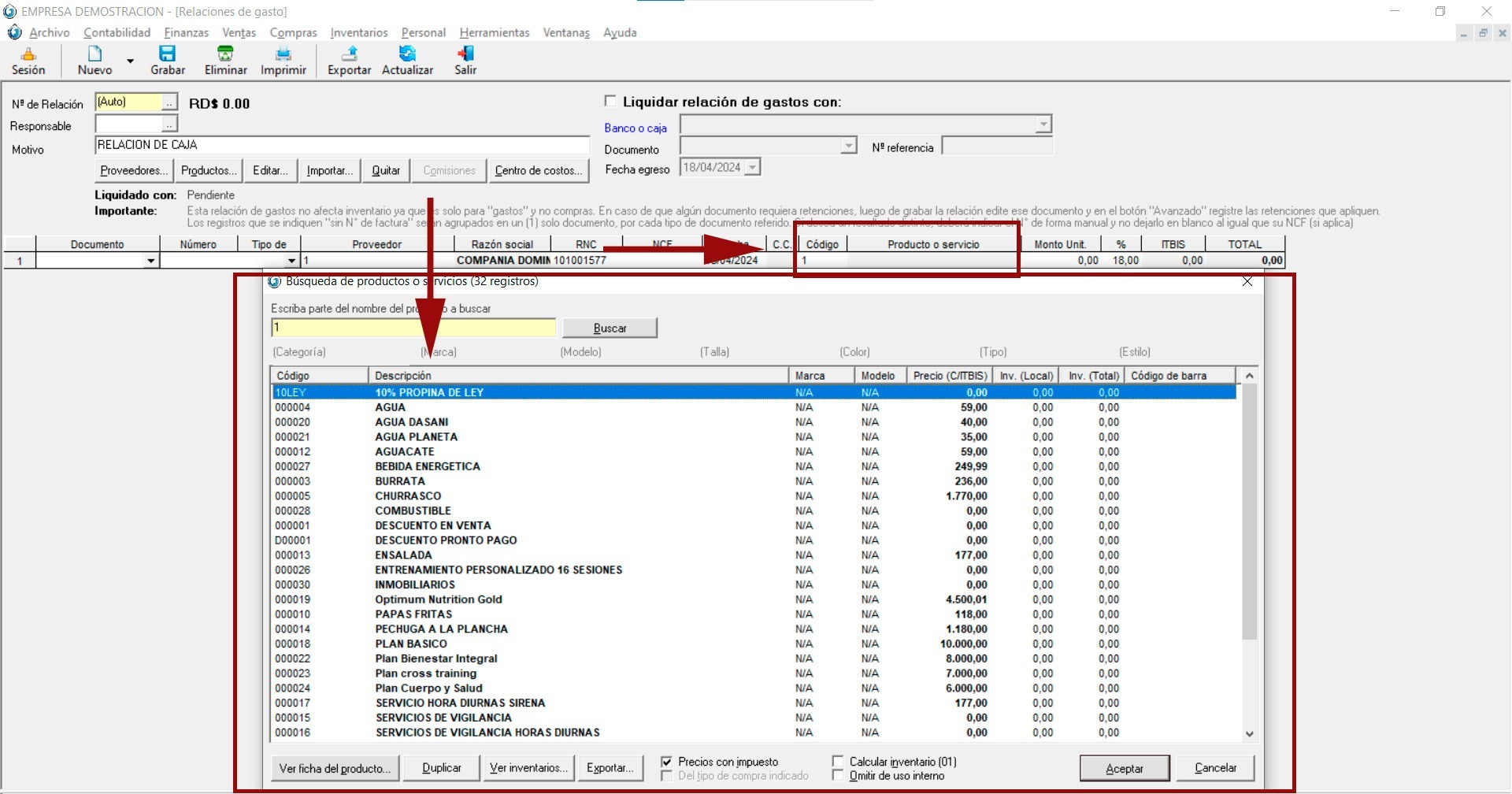 -CÓDIGO- PRODUCTO O SERVICIO…“REFERENCIA” ya seleccionado …“REFERENCIA”