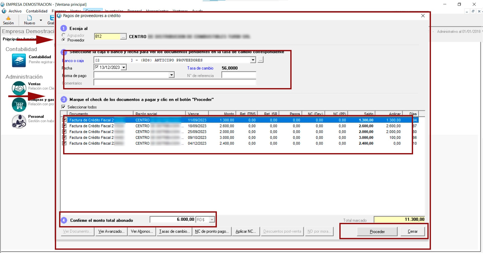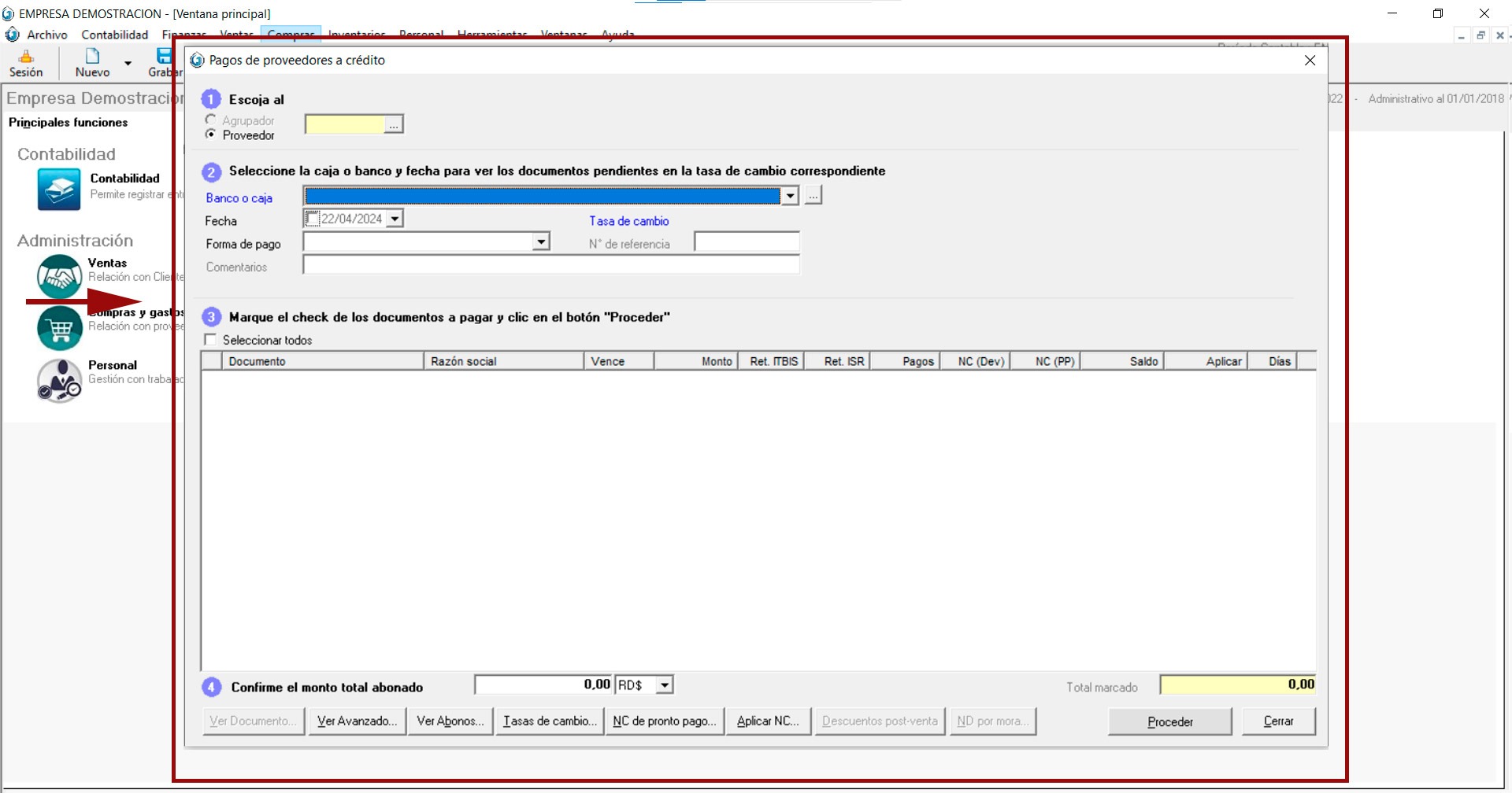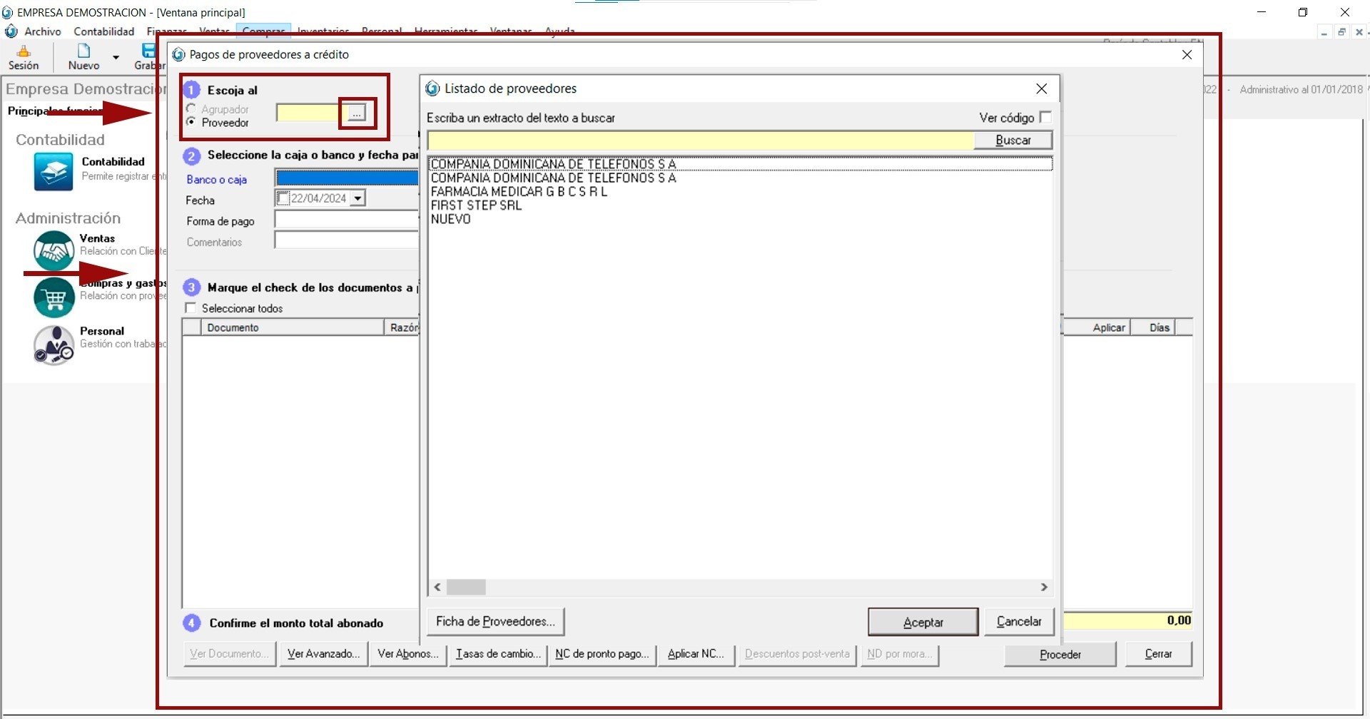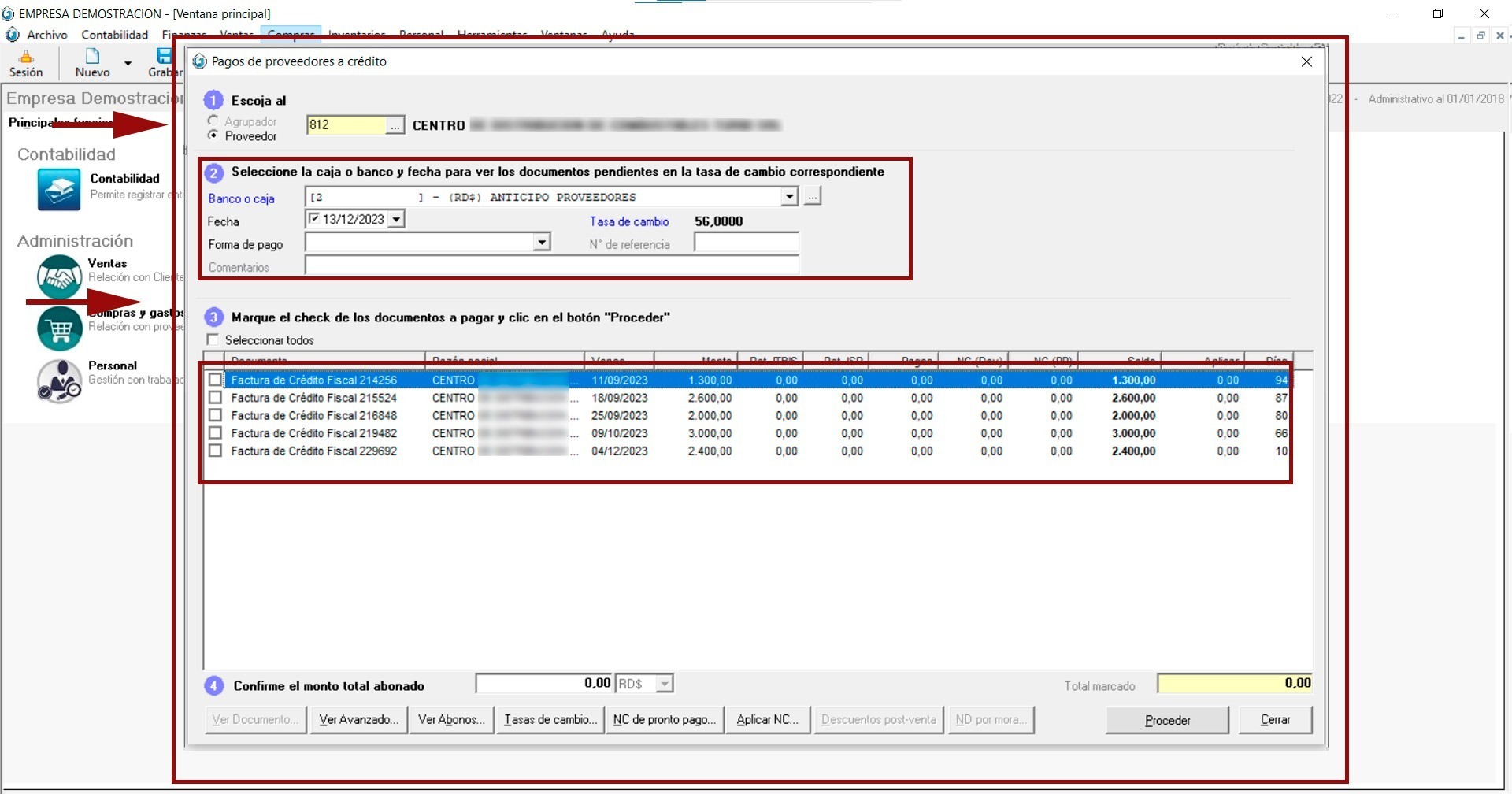 -Ingresamos al Menú > Compras > Pagos a proveedores a créditos >…“REFERENCIA” se abrirá la siguiente ventana… “REFERENCIA”, En esta ventana podremos buscar el proveedor …“REFERENCIA” , Seleccionamos el banco o caja y la fecha para ver qué documentos tenemos pendientes …“REFERENCIA”