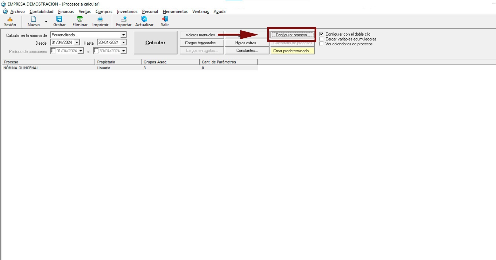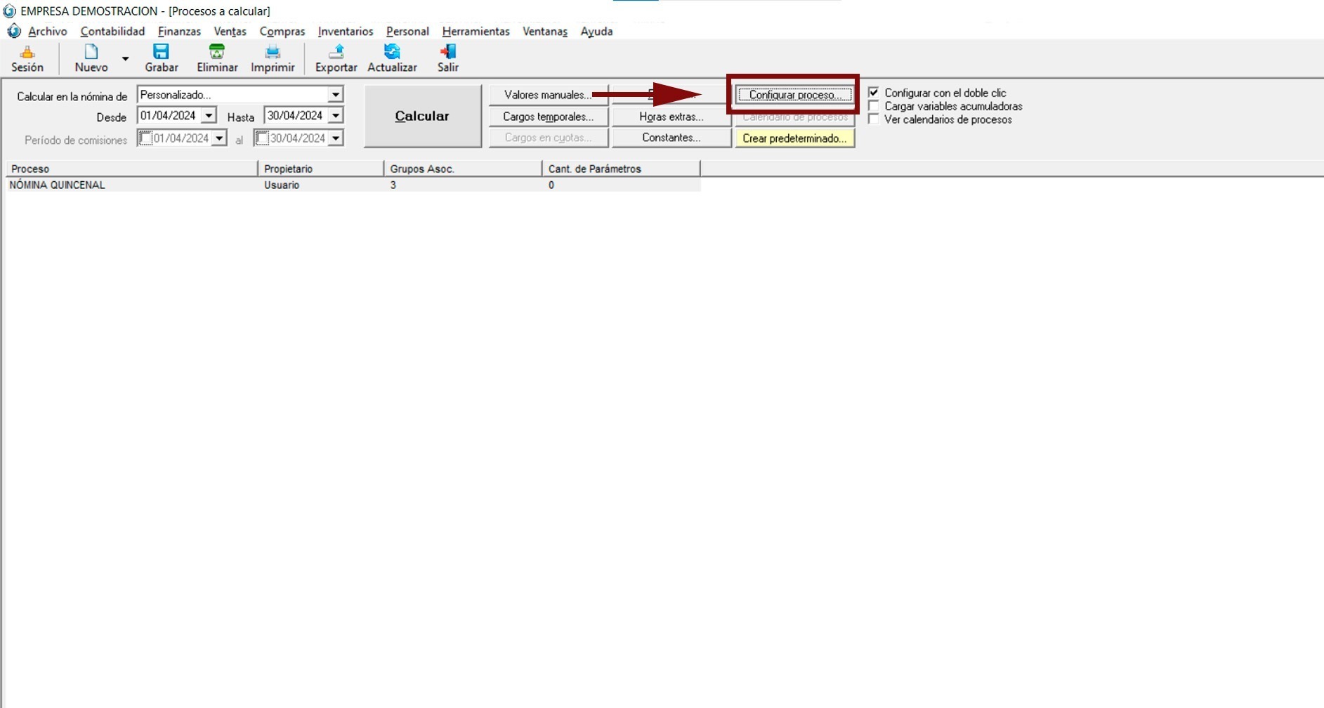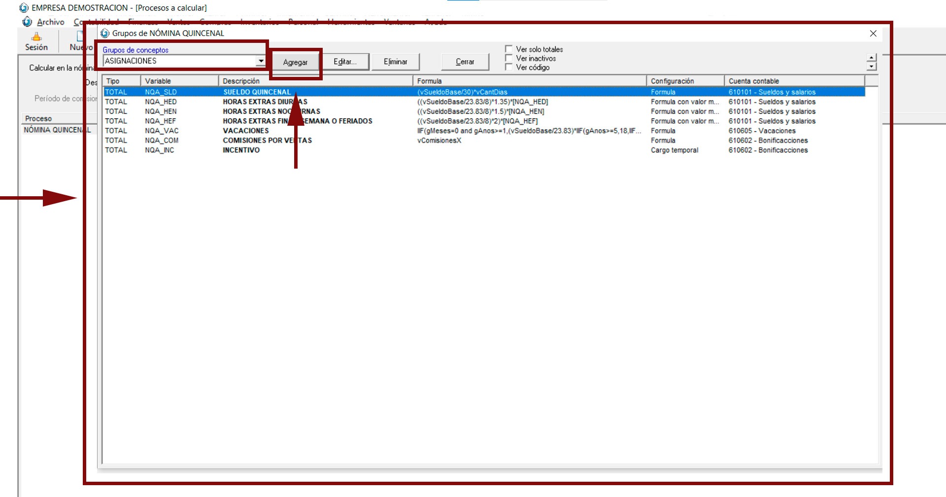 -Para realizar esto vamos al menú> Personal > Procesos a calcular…“REFERENCIA”> Dentro de la ventana procesos > Dar clic al botón configurar procesos “REFERENCIA”>Seleccionamos el concepto a crear …“REFERENCIA”> Hacemos clic en el botón «Agregar» junto a los grupos de conceptos…“REFERENCIA”> Se abrirá una ventana con todas las configuraciones disponibles…“REFERENCIA”