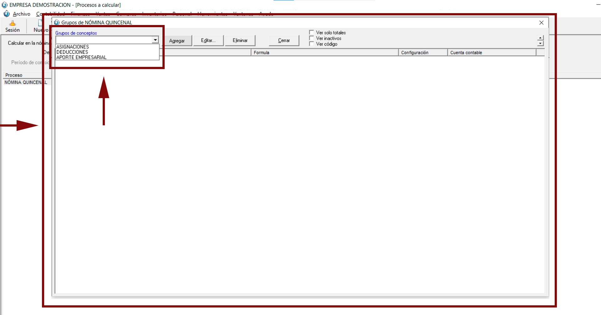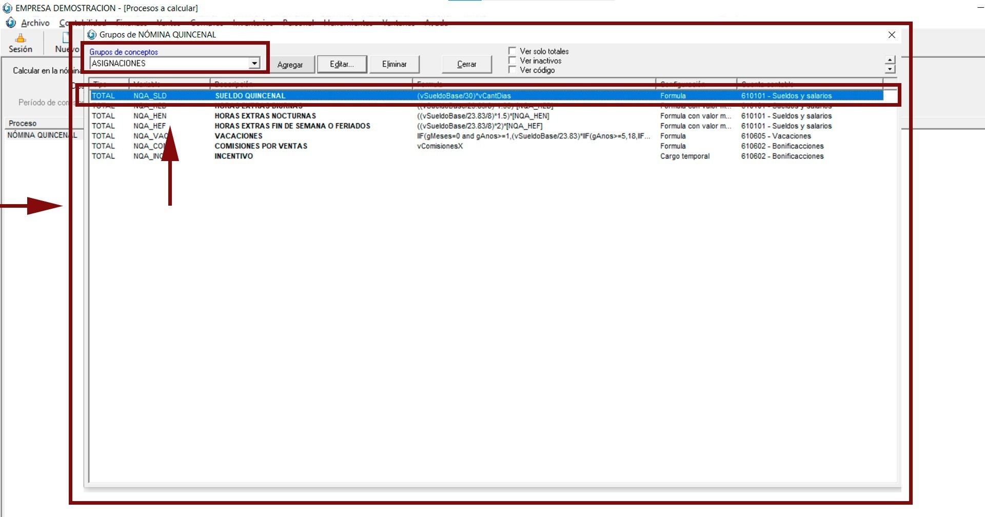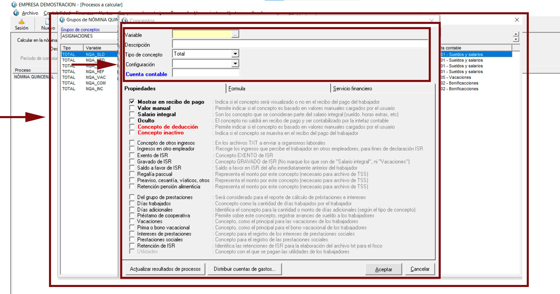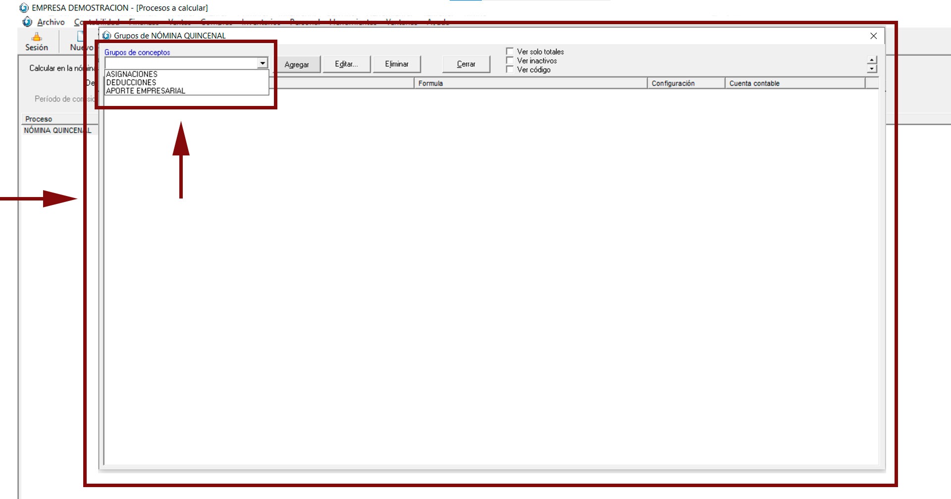 -Para realizar esto vamos al menú> Personal > Procesos a calcular…“REFERENCIA”> Dentro de la ventana procesos > Dar clic al botón configurar procesos “REFERENCIA”>Seleccionamos el concepto a crear …“REFERENCIA”> Hacemos clic en el botón «Agregar» junto a los grupos de conceptos…“REFERENCIA”> Se abrirá una ventana con todas las configuraciones disponibles…“REFERENCIA”