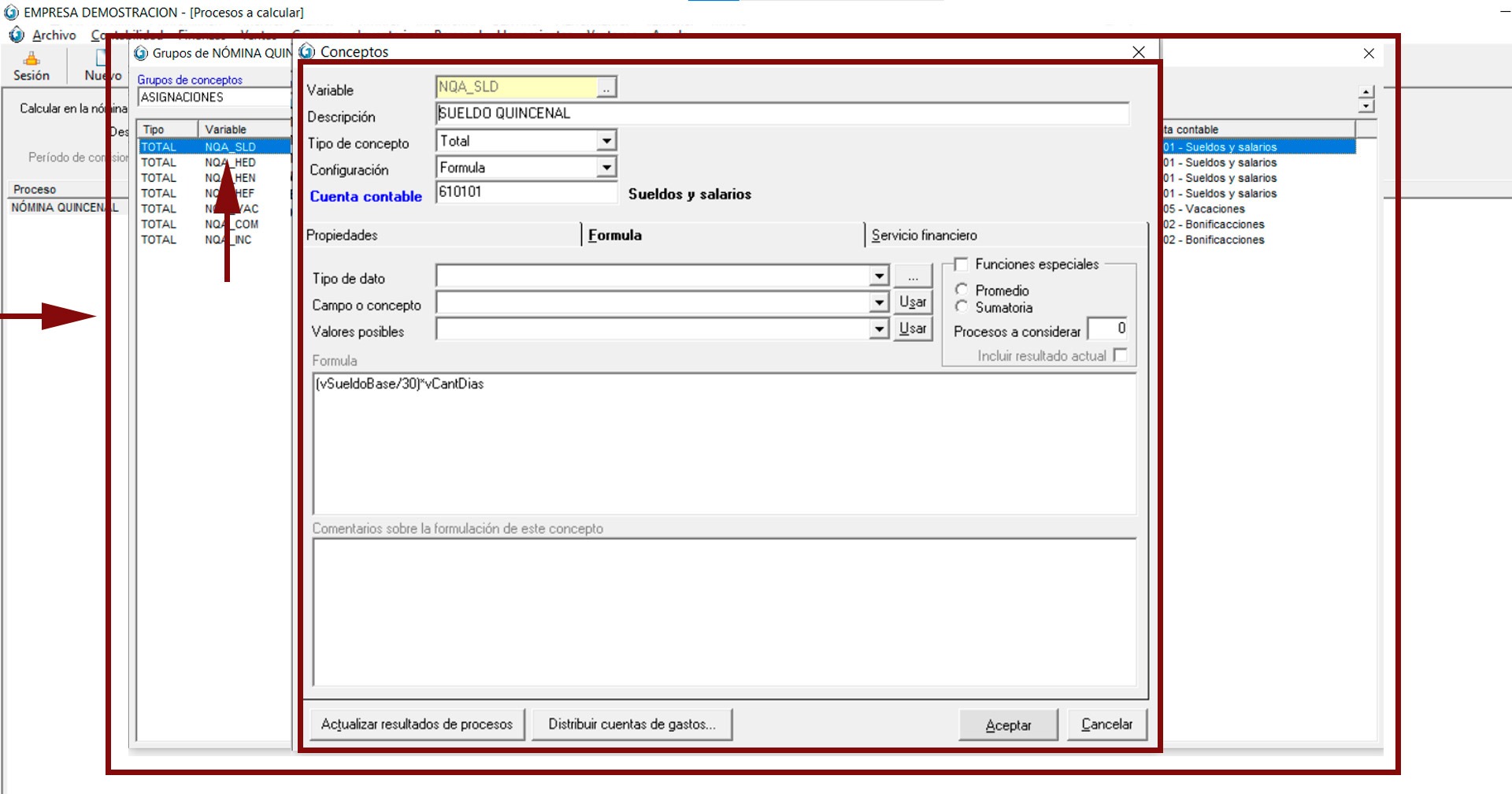 -Para realizar esto vamos al menú> Personal > Procesos a calcular…“REFERENCIA” > Dentro de la ventana procesos > Dar clic al botón configurar procesos “REFERENCIA” > Se abrirá una ventana  donde  seleccionaremos el grupo de conceptos a modificar  (Asignaciones, Deducciones, Aportes empresariales)…“REFERENCIA”> Seleccionamos el concepto que vamos a modificar dando doble clic …“REFERENCIA”> Se abrirá una nueva ventana con la información de la variable en la que estamos …“REFERENCIA”