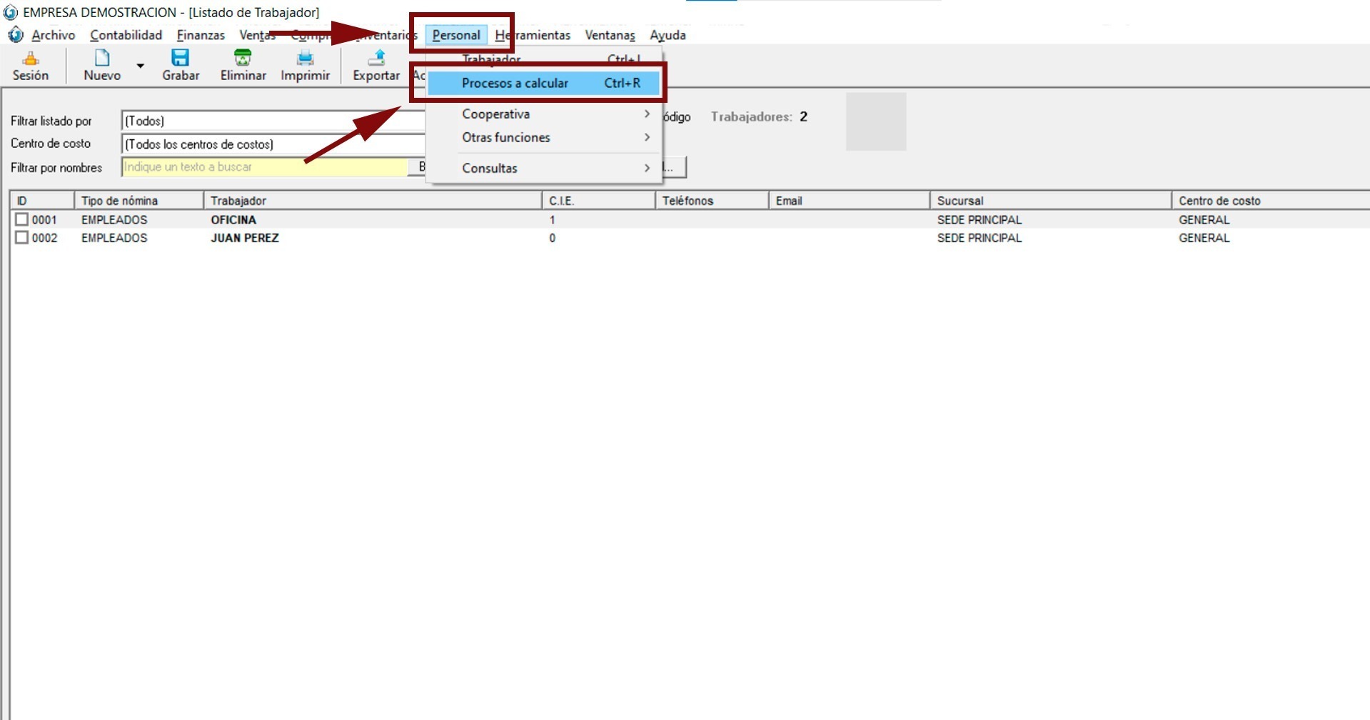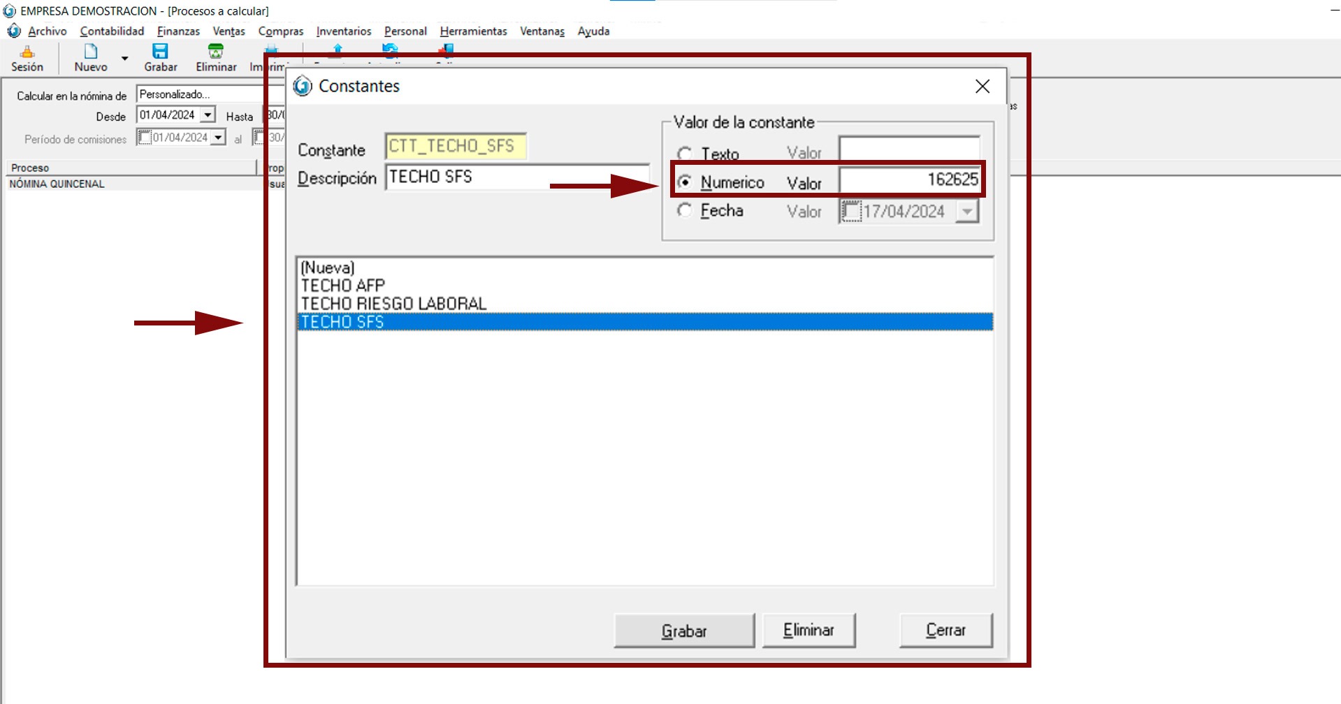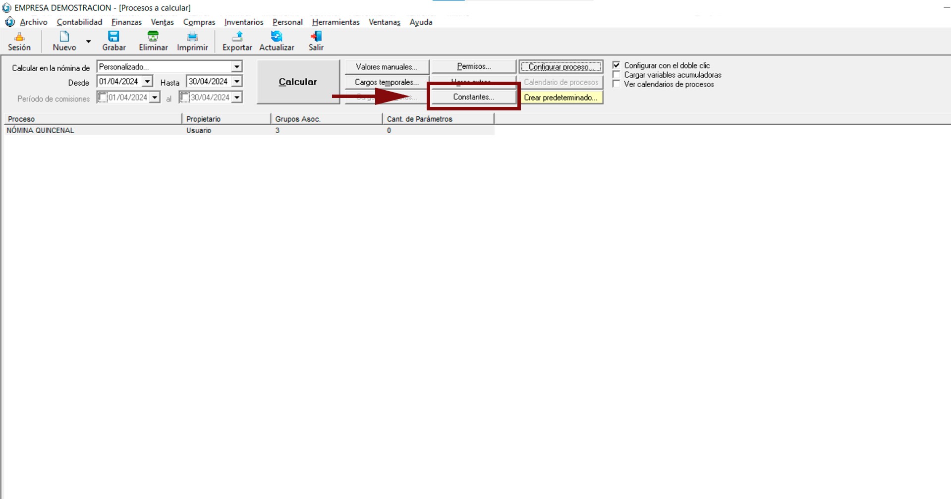 -Para realizar esto vamos al menú> Personal > Procesos a calcular…“REFERENCIA”> Dentro de la ventana procesos > Damos clic en el botón «CONSTANTES» “REFERENCIA”>Se abrirá una nueva ventana donde podremos configurar los valores de la constante …“REFERENCIA”