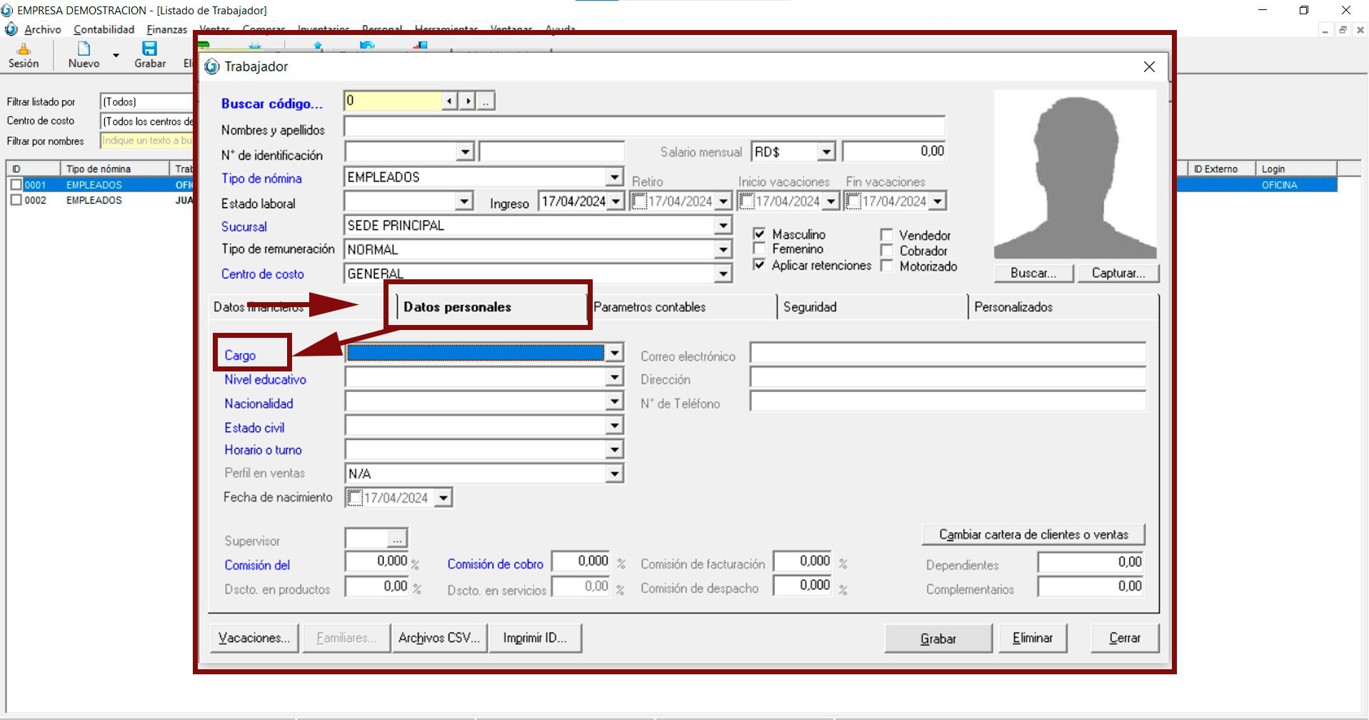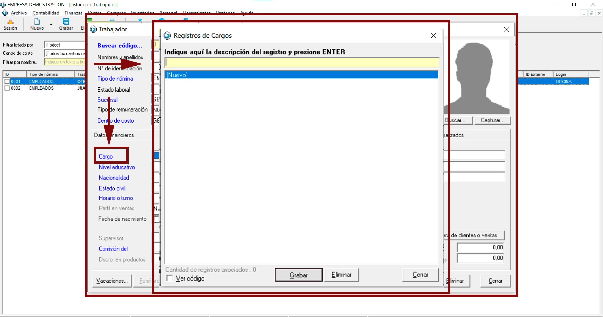 – Dar clic en el botón del menú Nuevo …“REFERENCIA“> se abrirá la ficha de creación de trabajador > Ingresamos en la pestaña de datos personales, En la casilla de «Cargo» haremos doble clic en las letras en azul…“REFERENCIA“> Se abrirá una ventana de «Registros de Cargos «…“REFERENCIA“> Realizar este procedimiento con los datos restantes…“REFERENCIA“