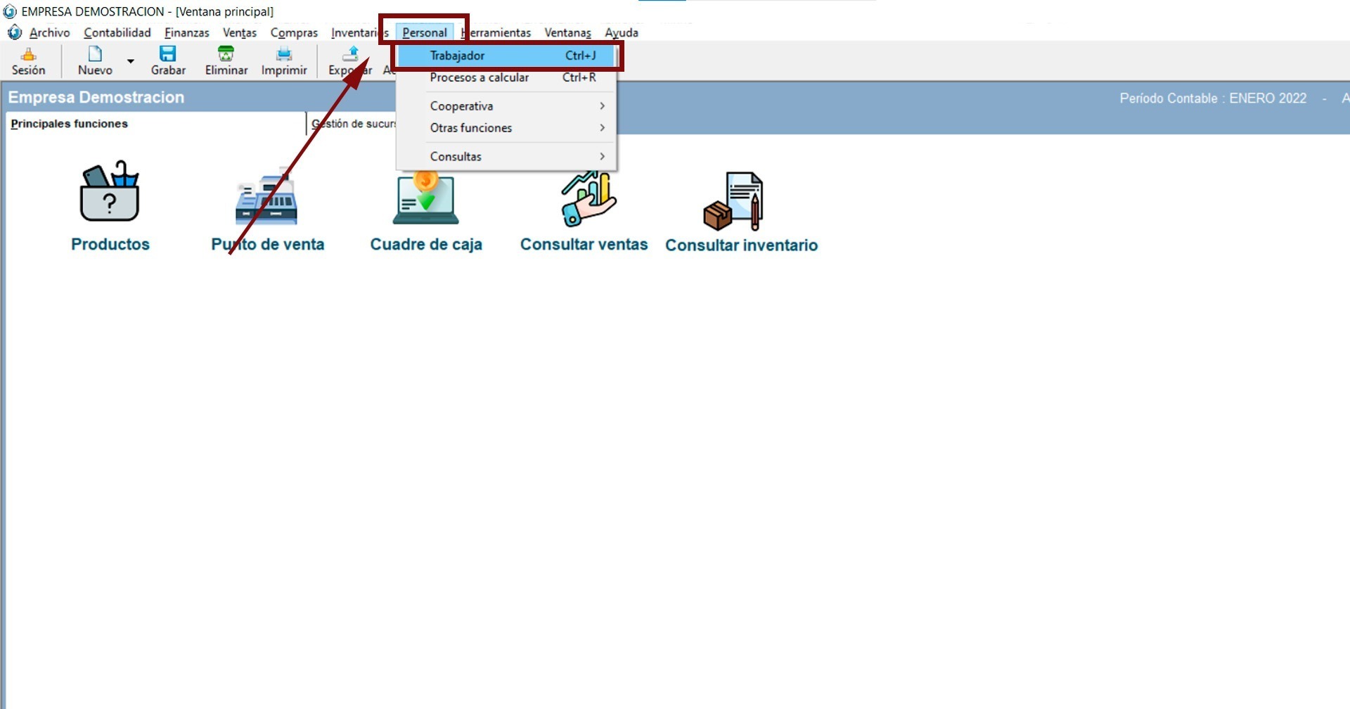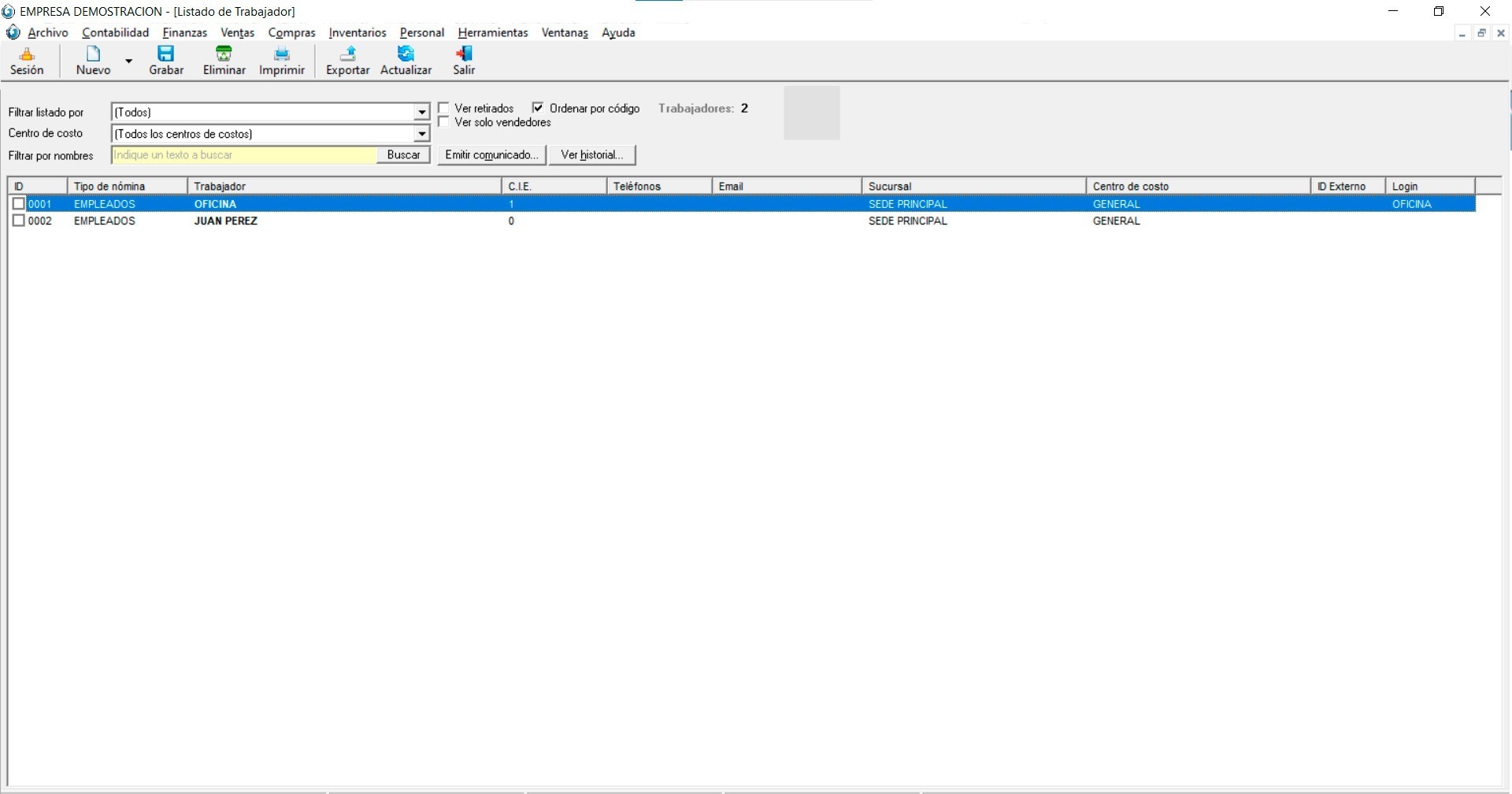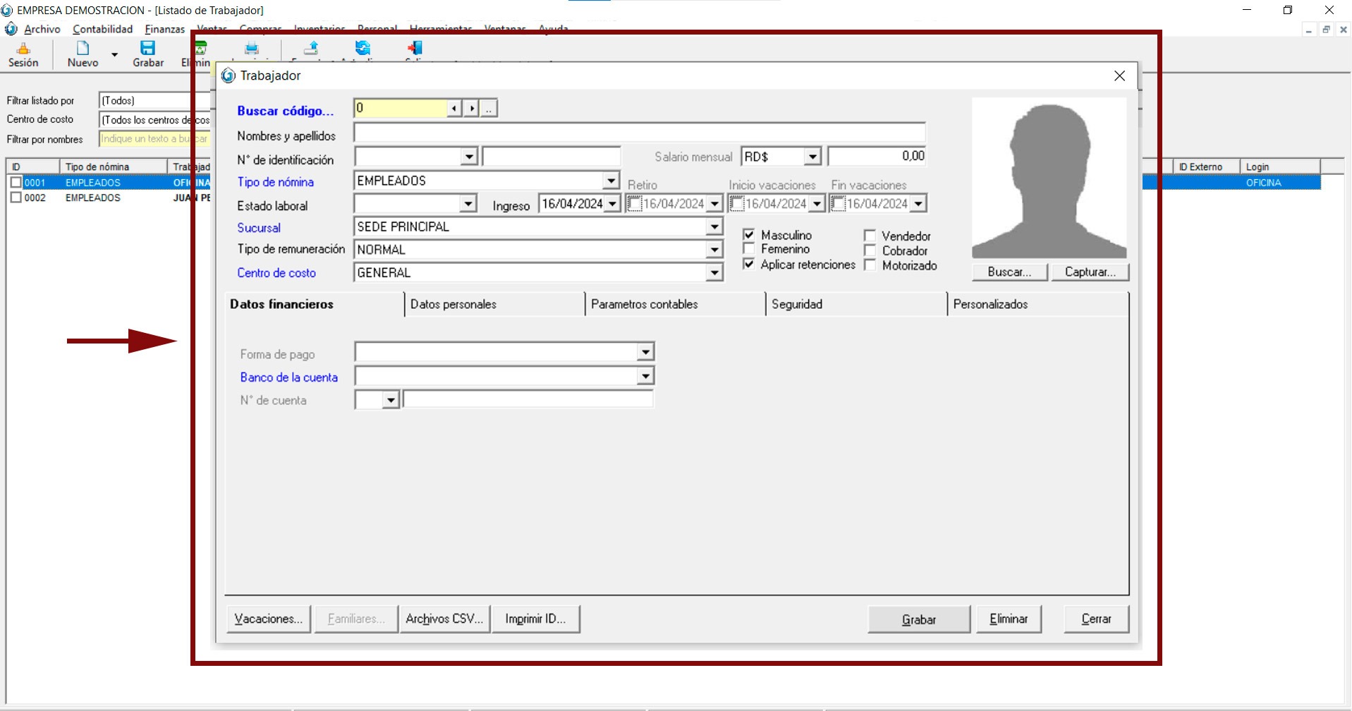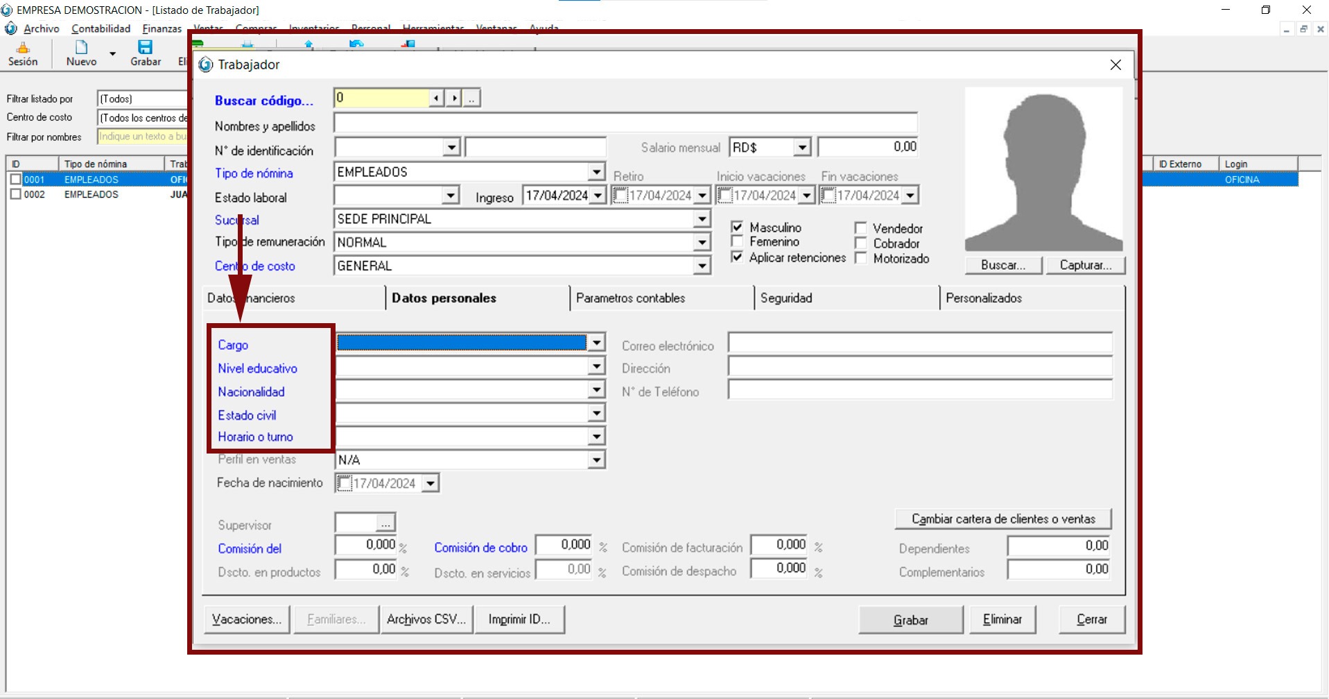 – Dar clic en el botón del menú Nuevo > se abrirá la ficha de creación de trabajador > Llenamos los datos  de nuestro trabajador … “REFERENCIA”