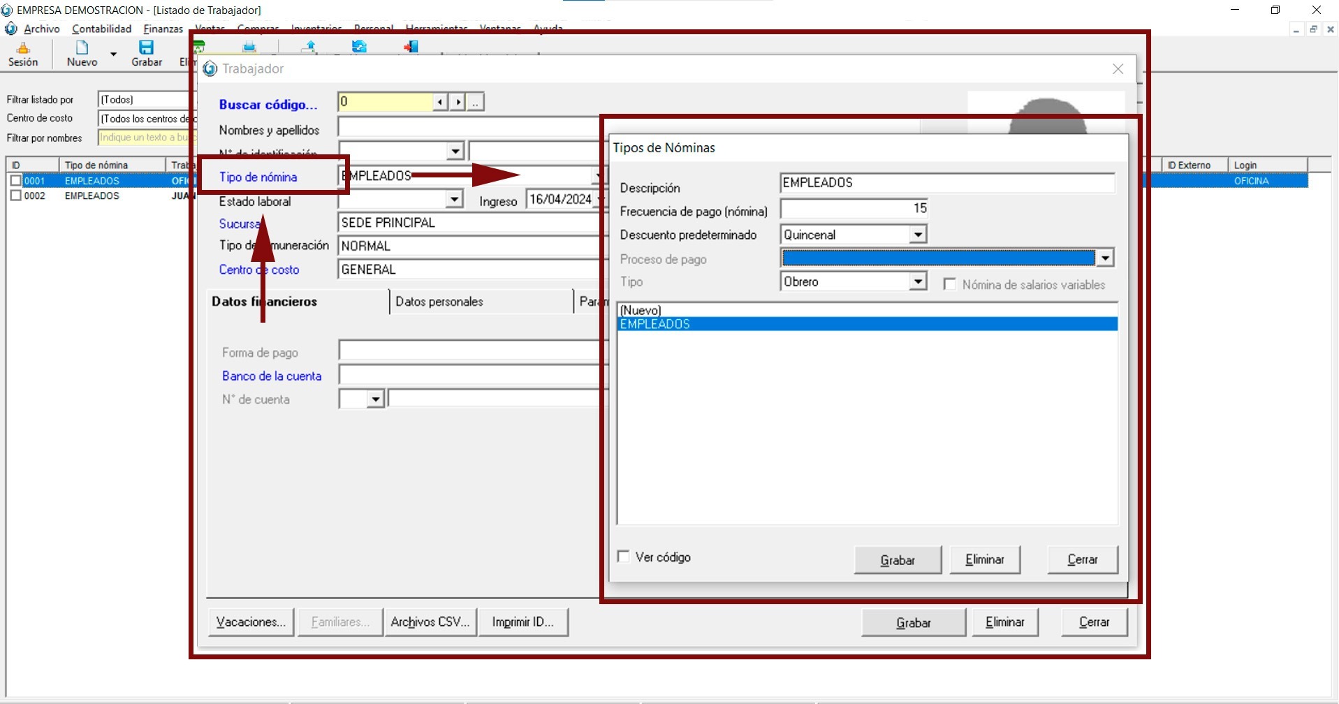 -Dentro de la ficha de creación del trabajador > Hacemos doble clic en el título en azul «Tipo de nómina «> Se abrirá una ventana para definir los tipos de nómina a implementar … “REFERENCIA”