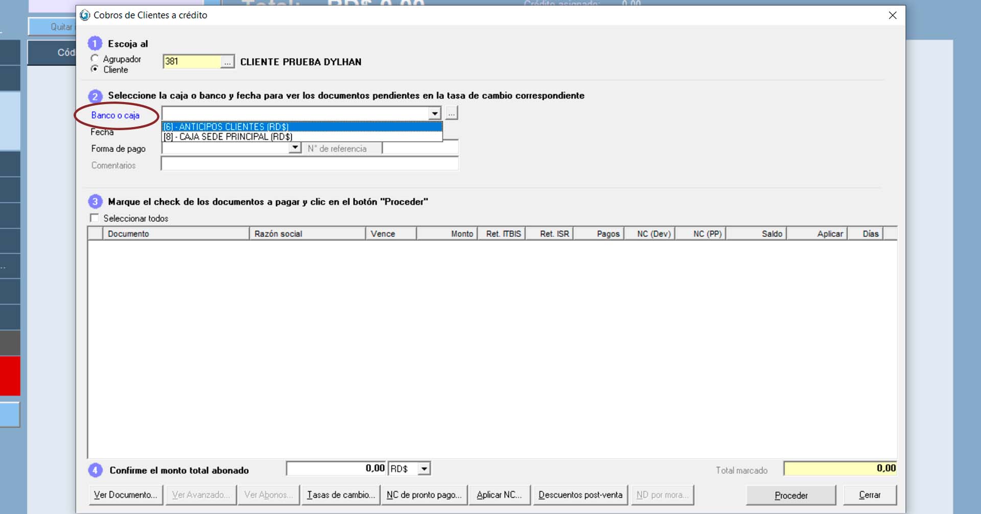 - En el campo de fondo amarillo, indique parte del texto de búsqueda para ubicar al cliente y presione {ENTER}. En la ventana de búsqueda haga 2clic sobre el cliente al cual desea registrar el cobro…”REFERENCIA”