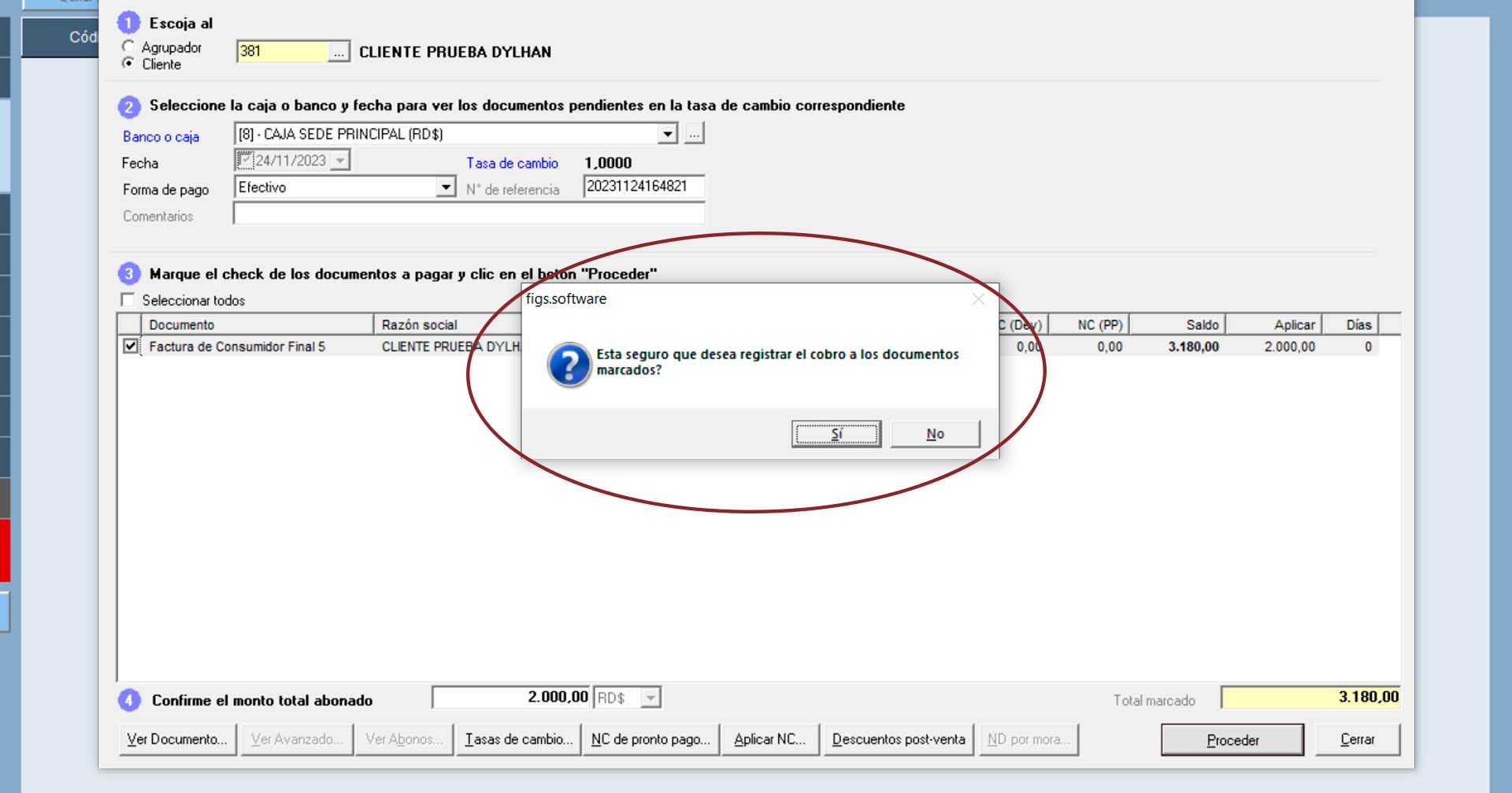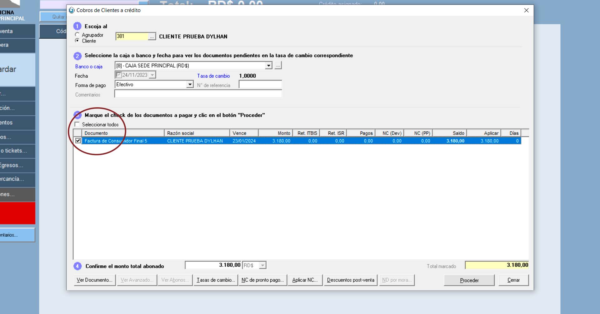 - Marque la casilla de verificación de aquellas facturas que desee afectar en el cobro…”REFERENCIA”