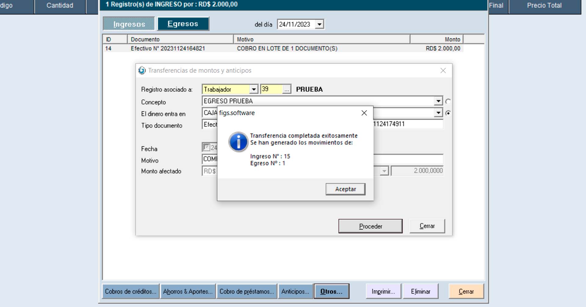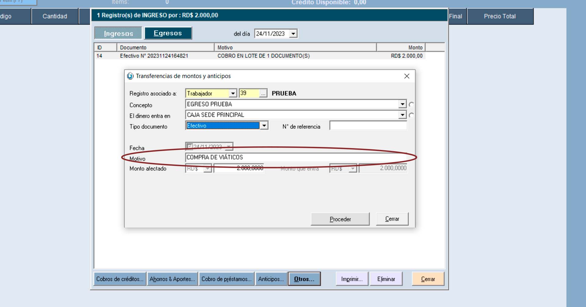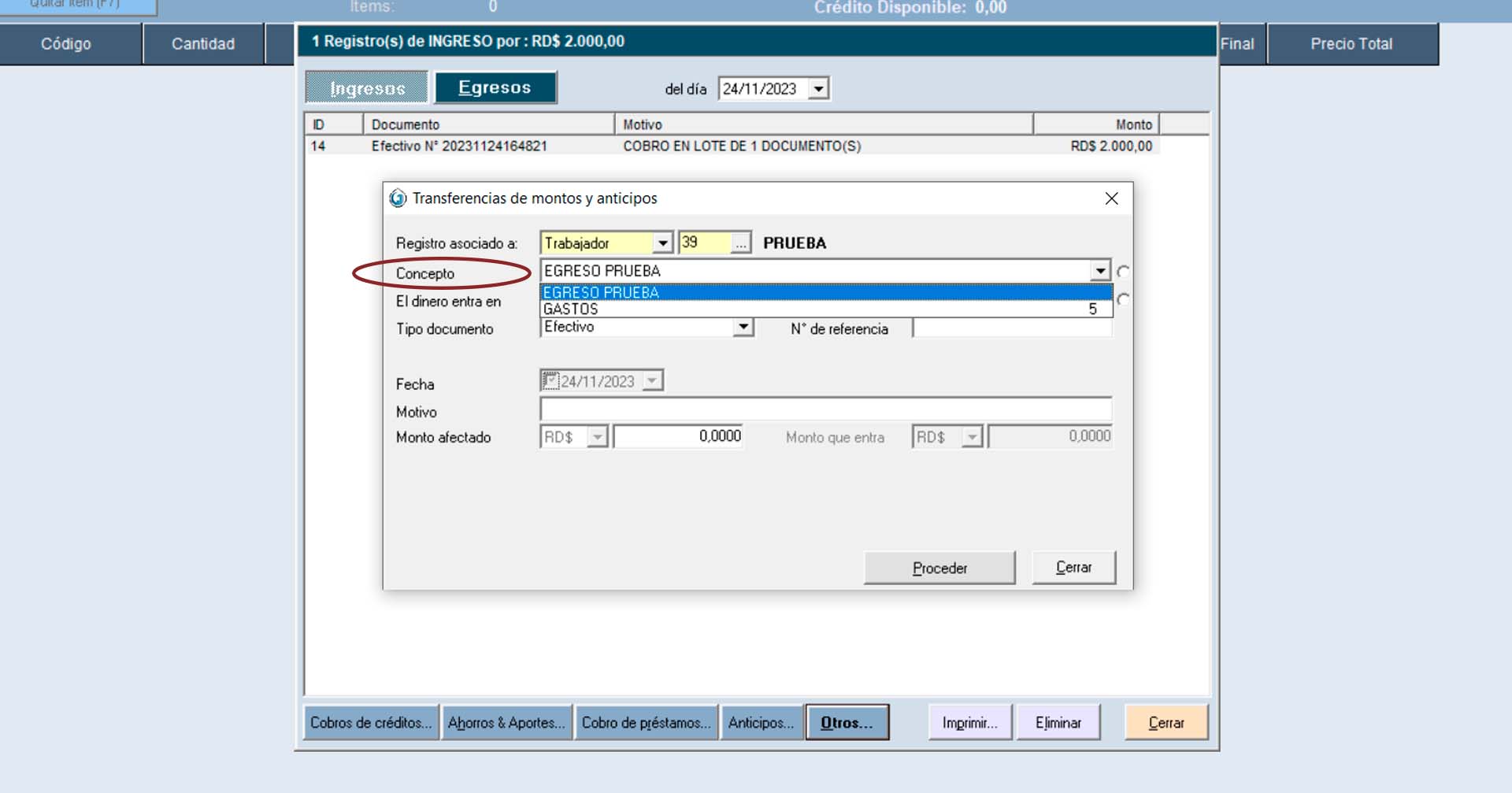 Cada cajero puede registrar ingresos o egresos por otros conceptos que no sean las ventas de contado, por lo que se agregaron las siguientes opciones para facilidad del usuario y su reporte en el cierre de caja.