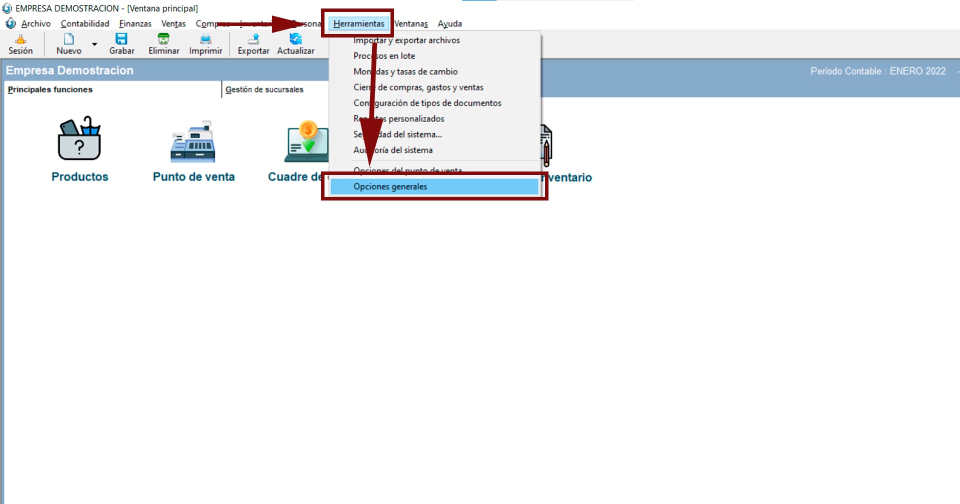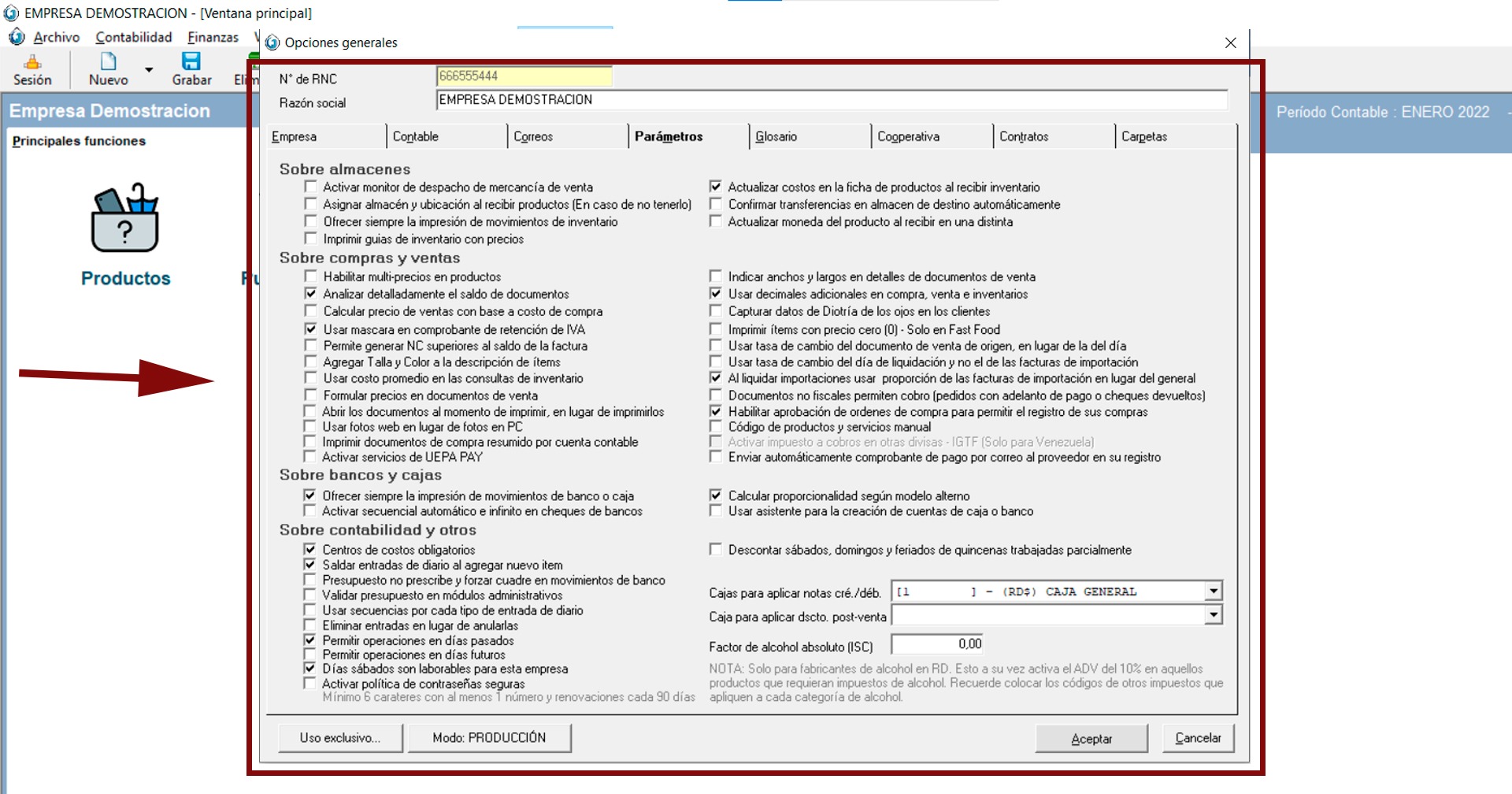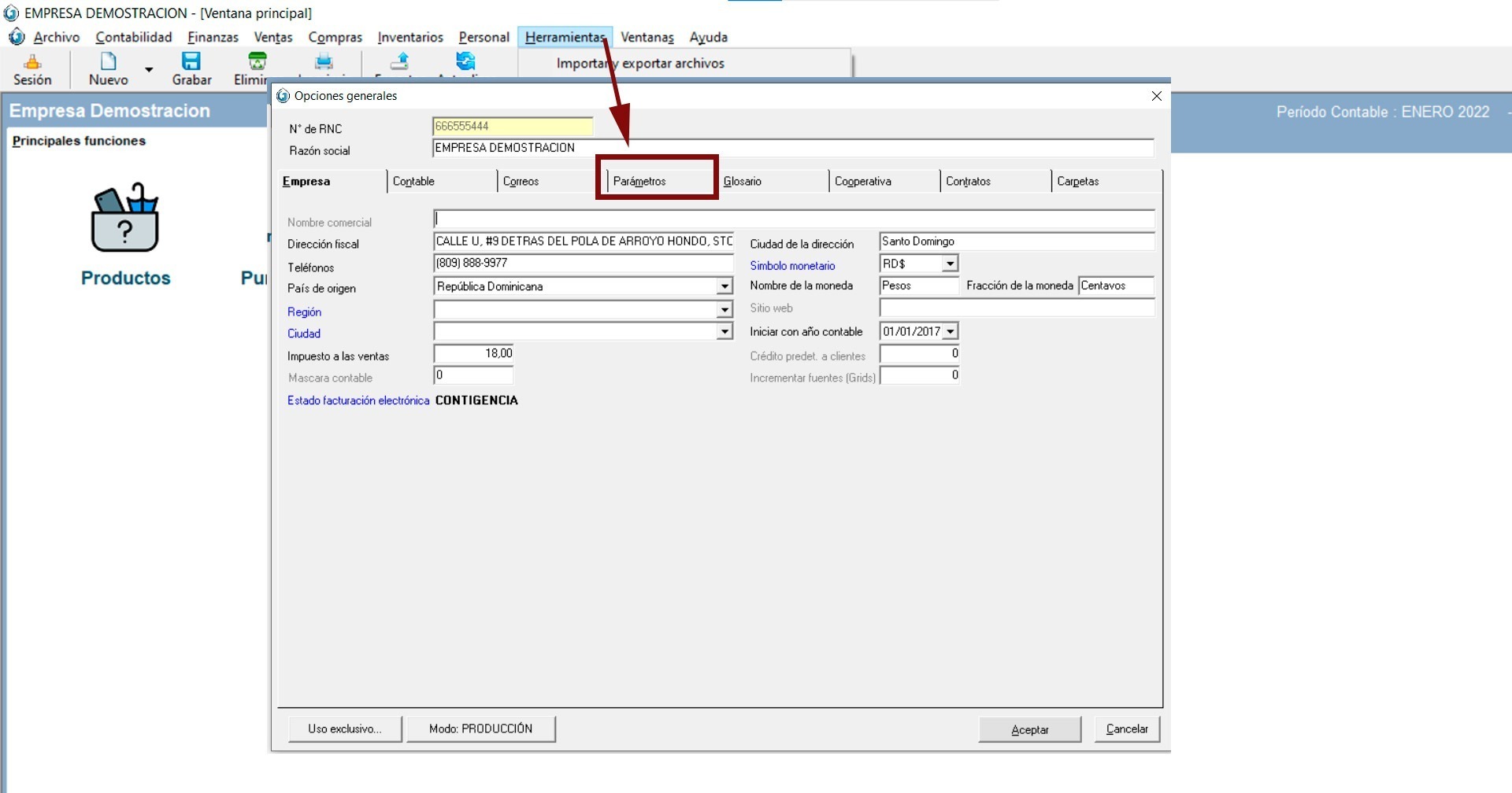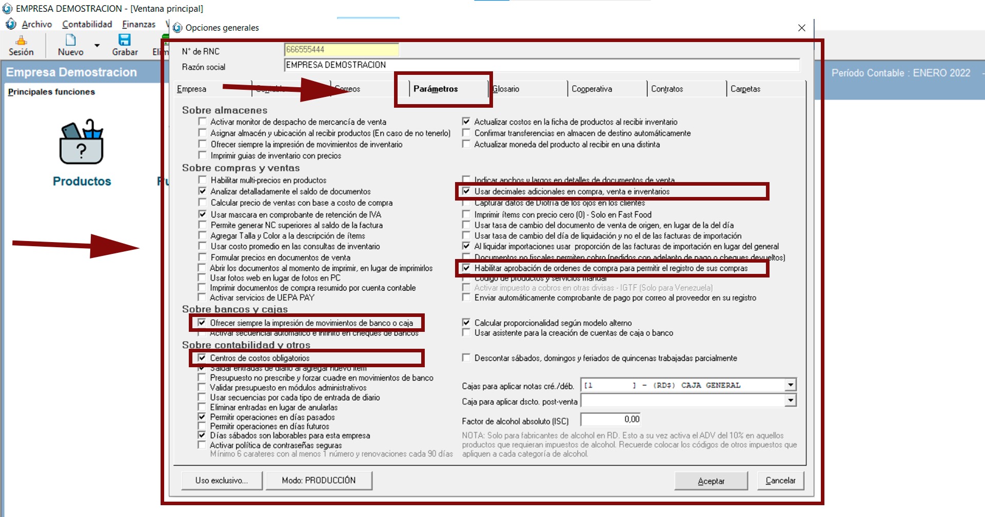 -Ingresamos al Menú > Herramientas > Opciones generales >…“REFERENCIA” se abrirá la siguiente ventana… “REFERENCIA” – Dar clic en la pestaña Parámetros > Se abrirá un listado de check … “REFERENCIA”