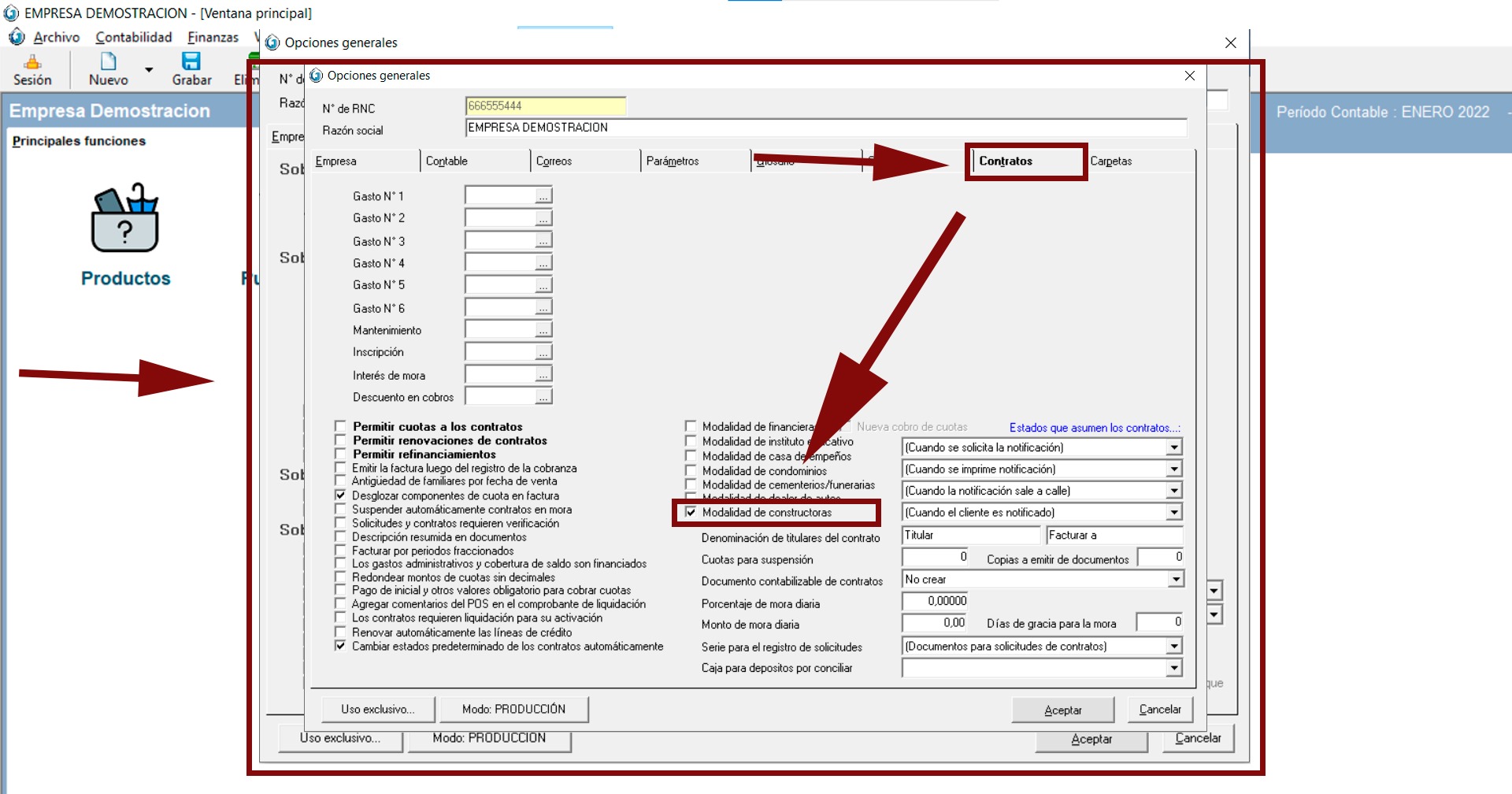 Para el correcto funcionamiento como constructora debemos activar los siguientes parámetros: