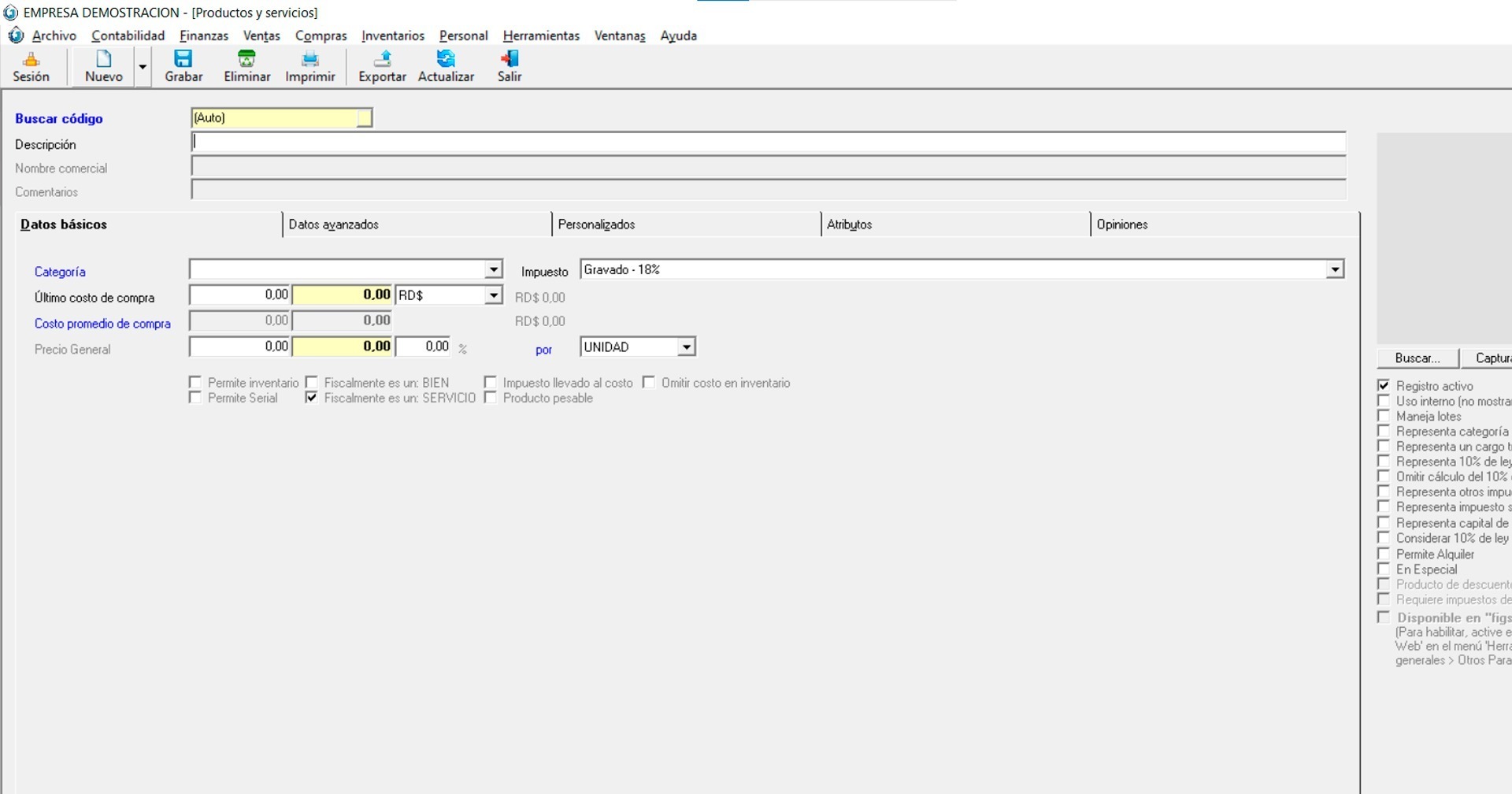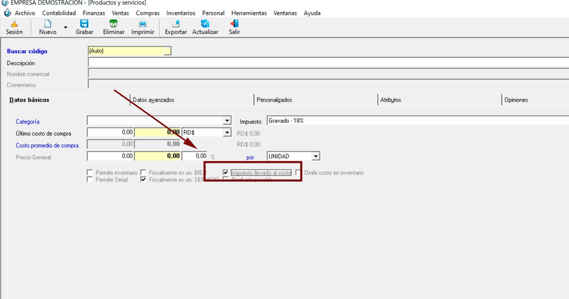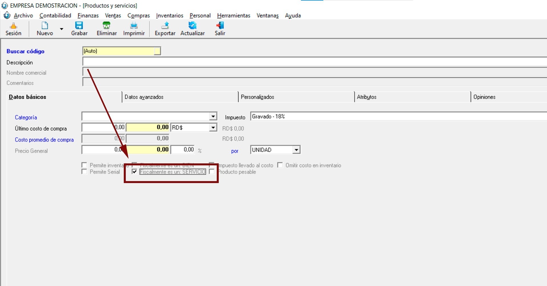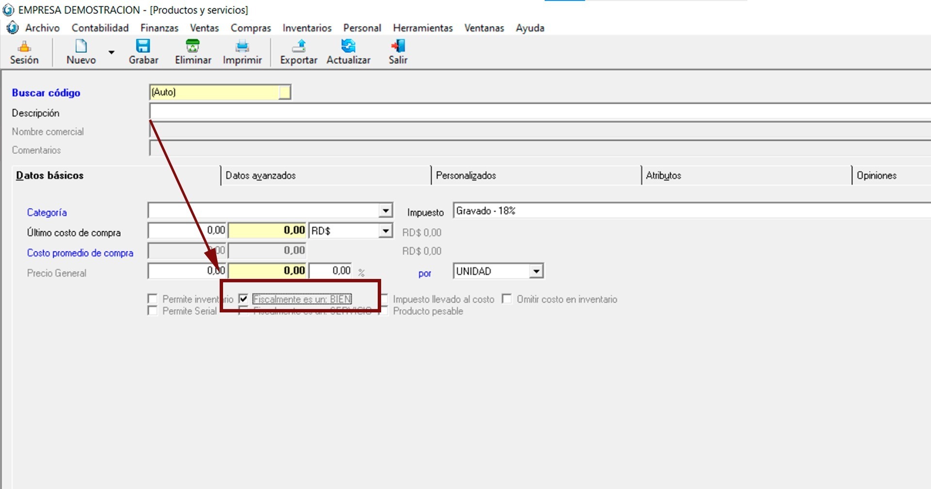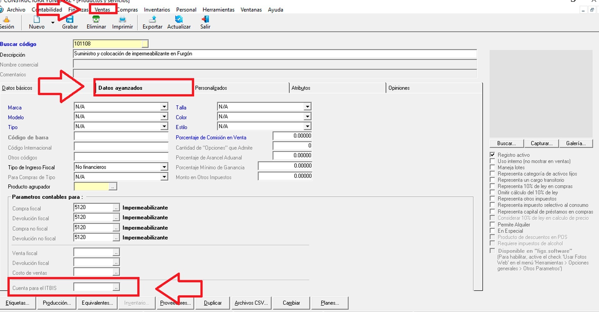 Opcional: Los productos deben tener configurado la cuenta de ITBIS que utiliza por clasificación, en la ficha del mismo pestaña avanzado opcional.